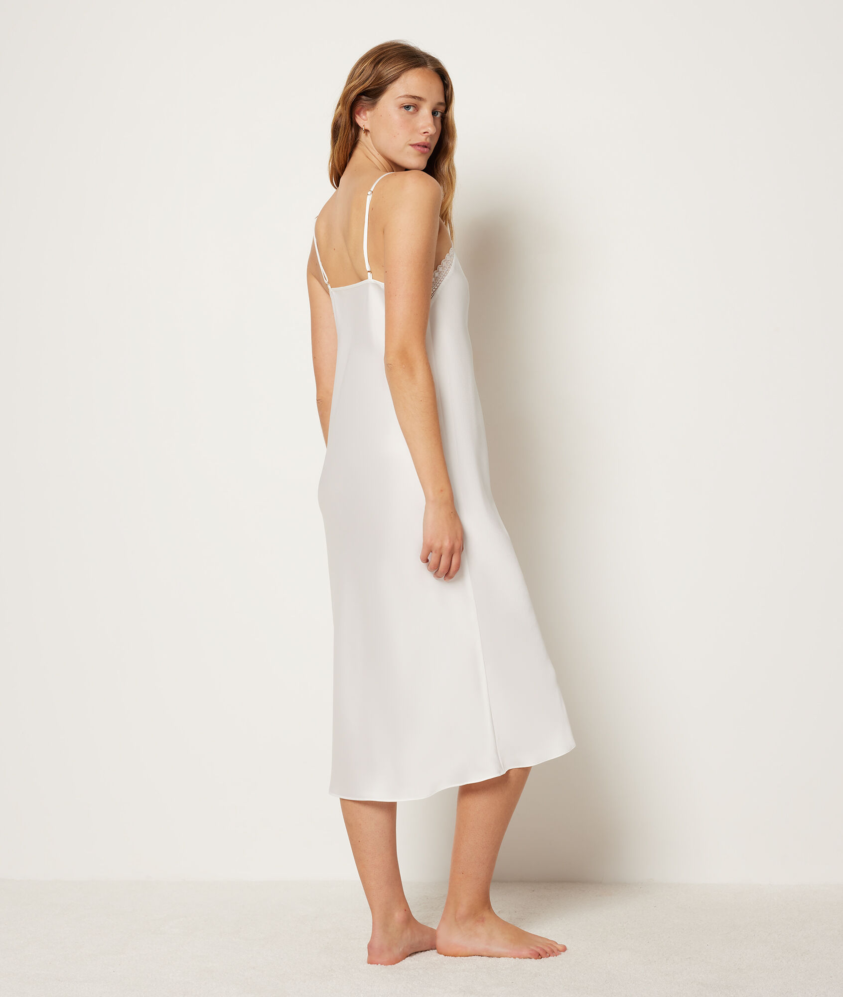Opt for a light and elegant nightwear by adopting this nightie in soft and satin material. Its lace details are delicately drawn on its neckline.