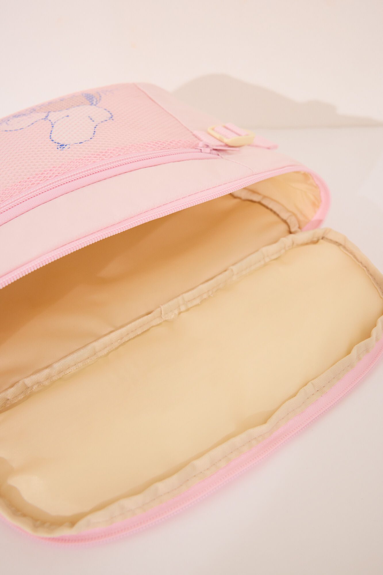 Large padded nylon toiletry vanity case in pink and lilac with a Snoopy license. With a practical handle, zippers, and an external pocket . Ideal for carrying all your beauty essentials on your travels. Padded design for added protection. Match