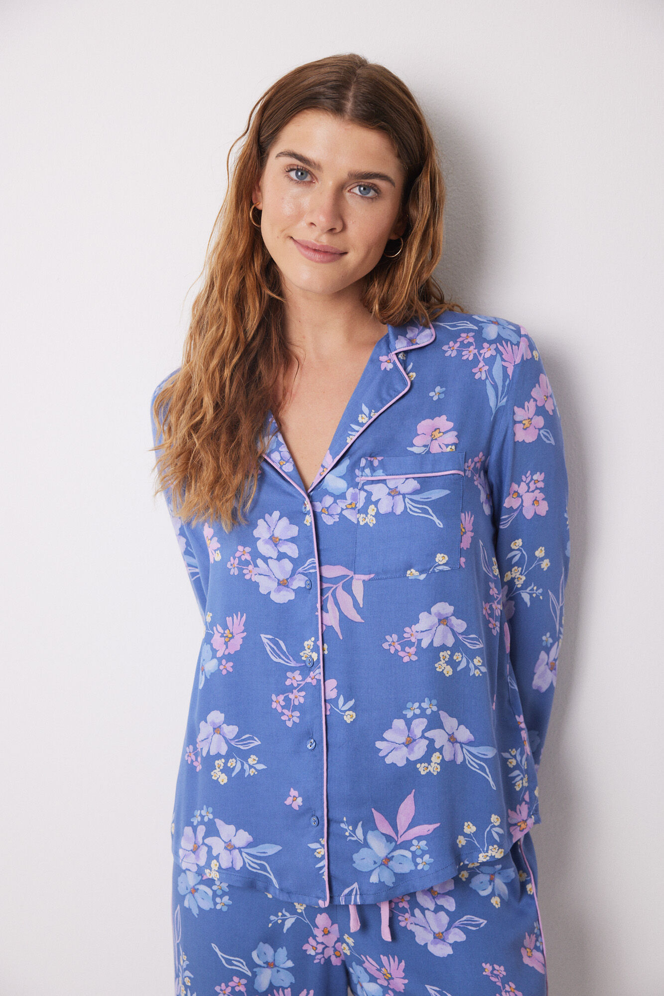 Shirt pajamas, consisting of a short sleeve shirt and long trouser , made with soft touch satin ECOVERO™ viscose fabric , in blue with a contrasting all-over floral print . Super soft and comfortable, you won”t want to take it off all day. Perfect for thi