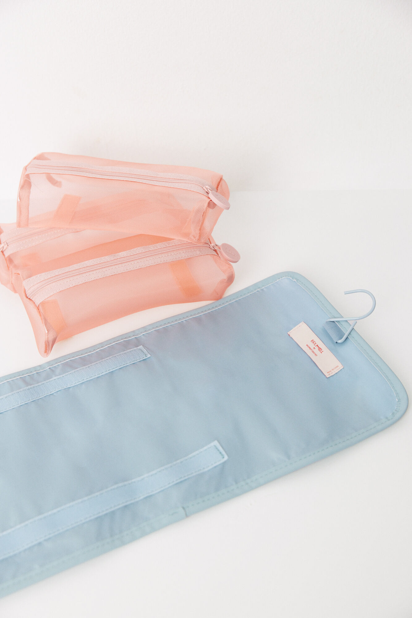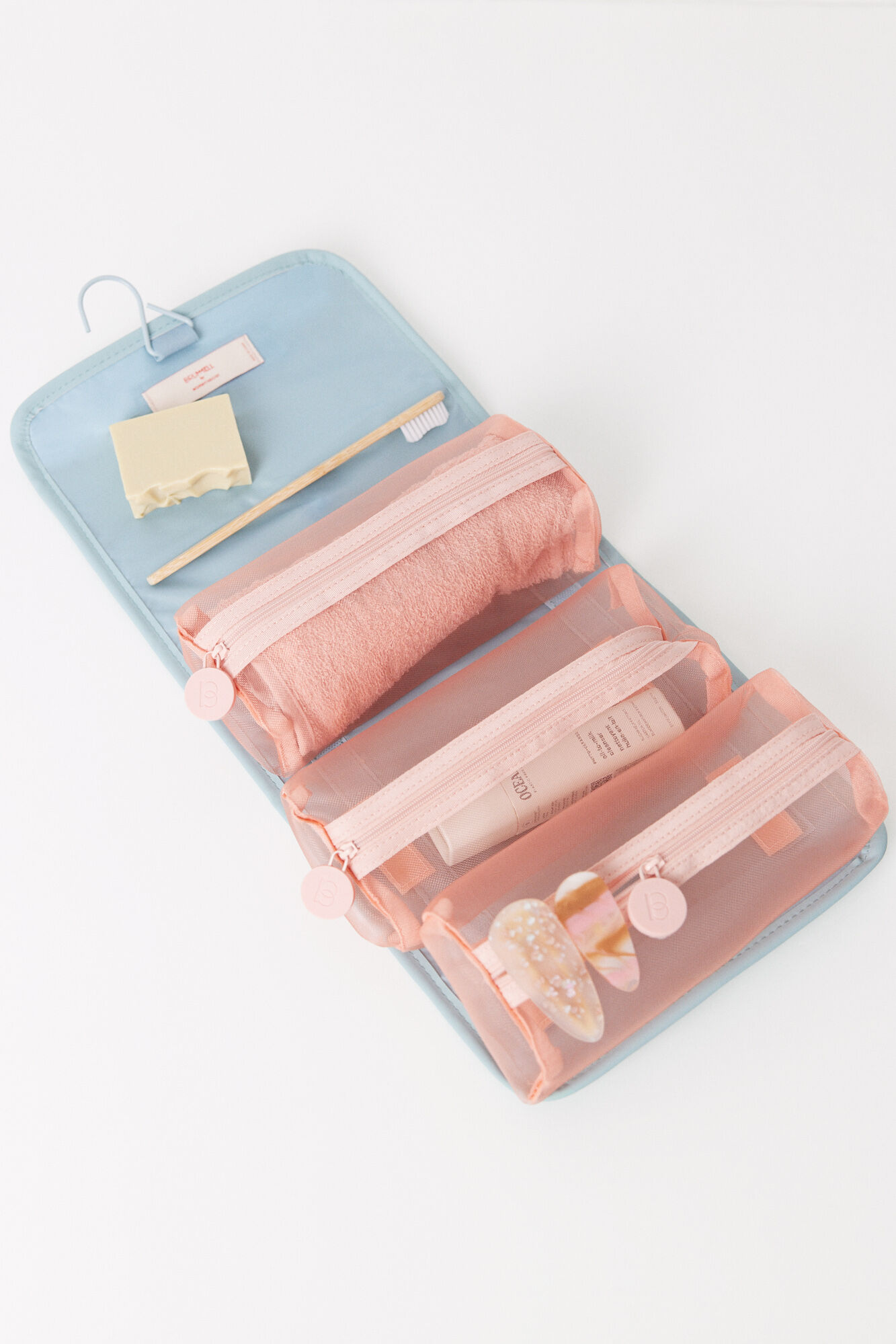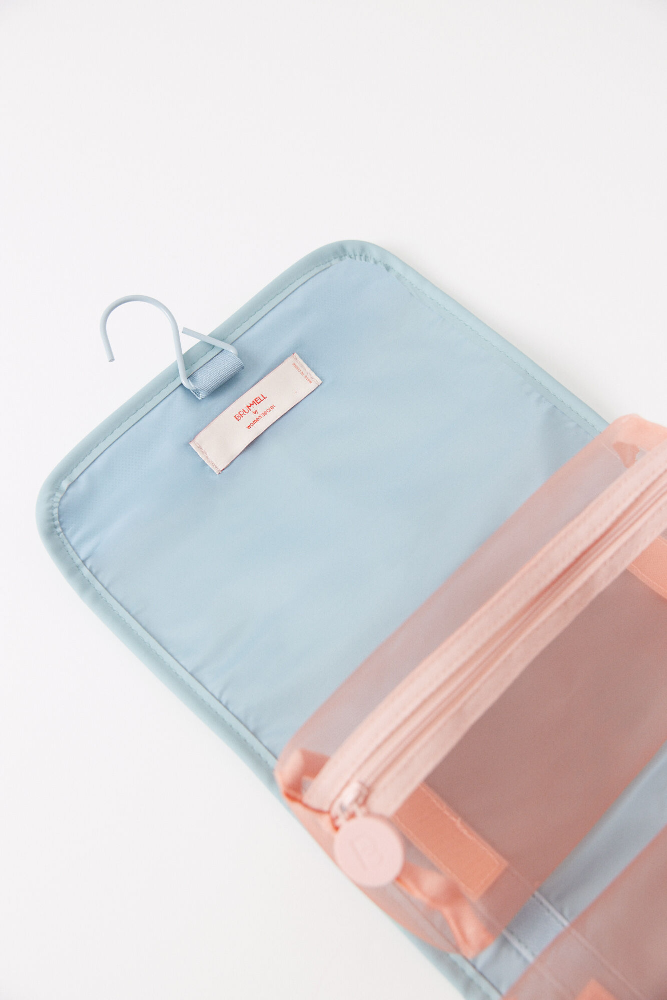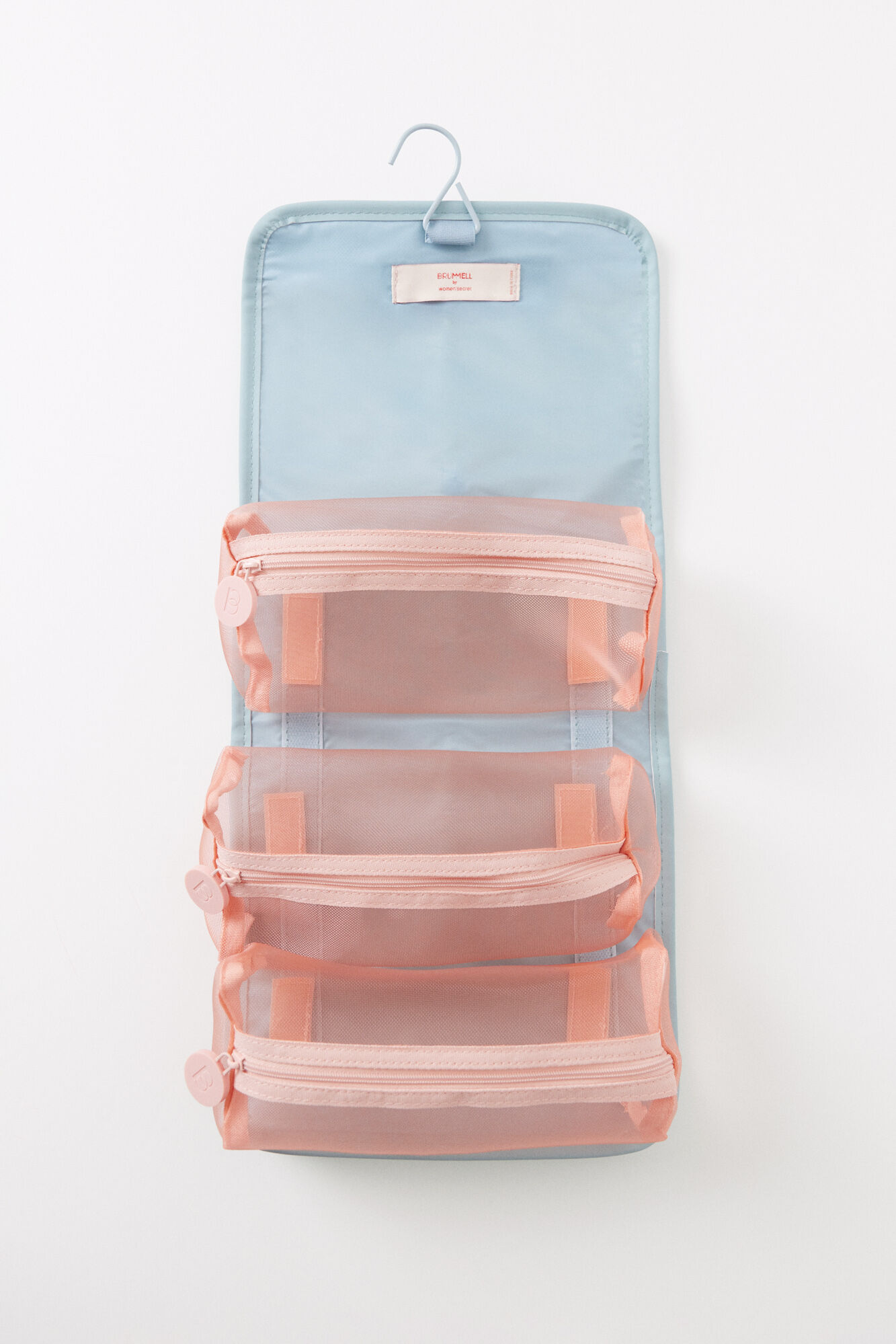 Medium toiletry bag, made of blue rubberized material with a hanger and adjustable elastic fastening . It has 3 compartments inside, made of mesh fabric with zip fastening closures, perfect for organizing your essentials.