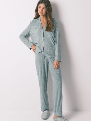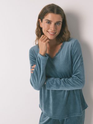 Two-piece pajamas, consisting of a short-sleeved T-shirt and print Capri trouser , made with soft touch viscose fabric , in a beautiful blue color. Super soft and comfortable, you won”t want to take it off all day. Perfect for this season! T-shirt with a
