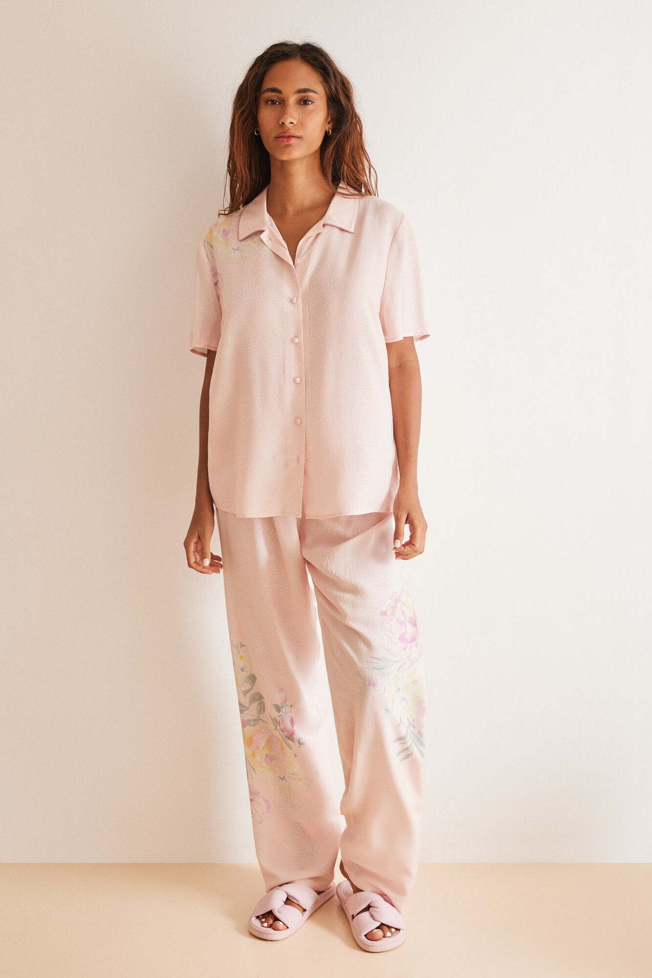 Classic pyjamas in viscose, with short-sleeved shirt and trousers, in a floral print. It”s so practical and convenient, that you won”t want to take it off all day. Perfect for this summer! & Lt; br & gt;-Top with shirt collar, central buttons and detail o