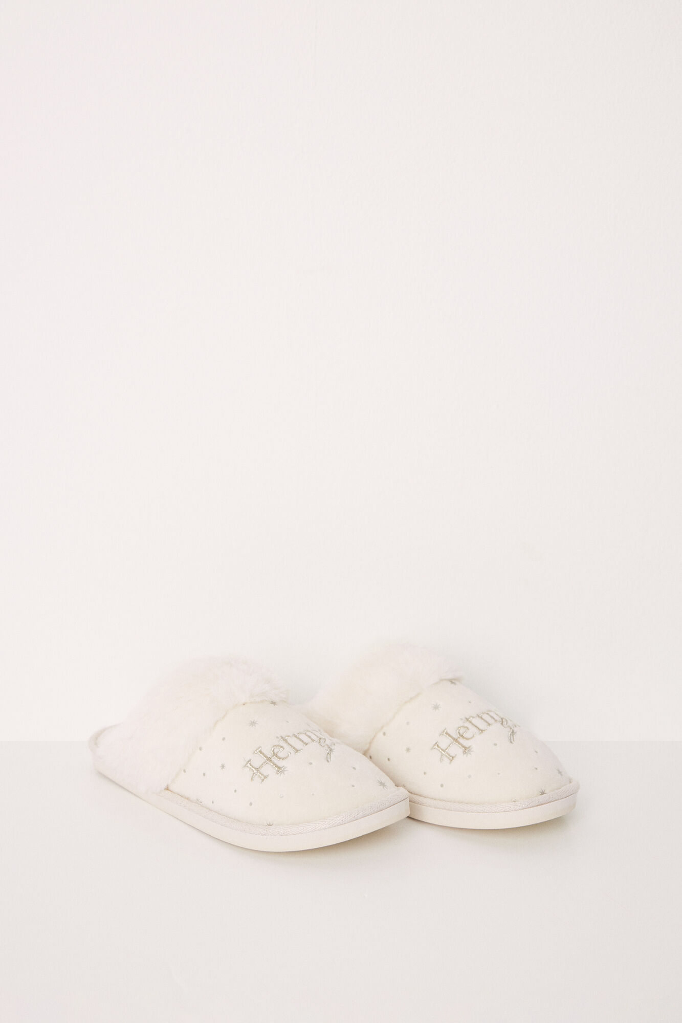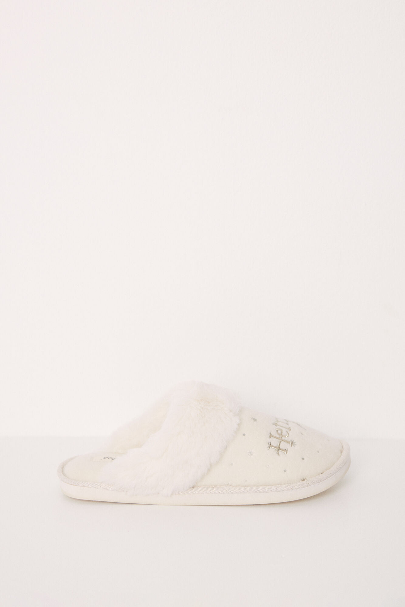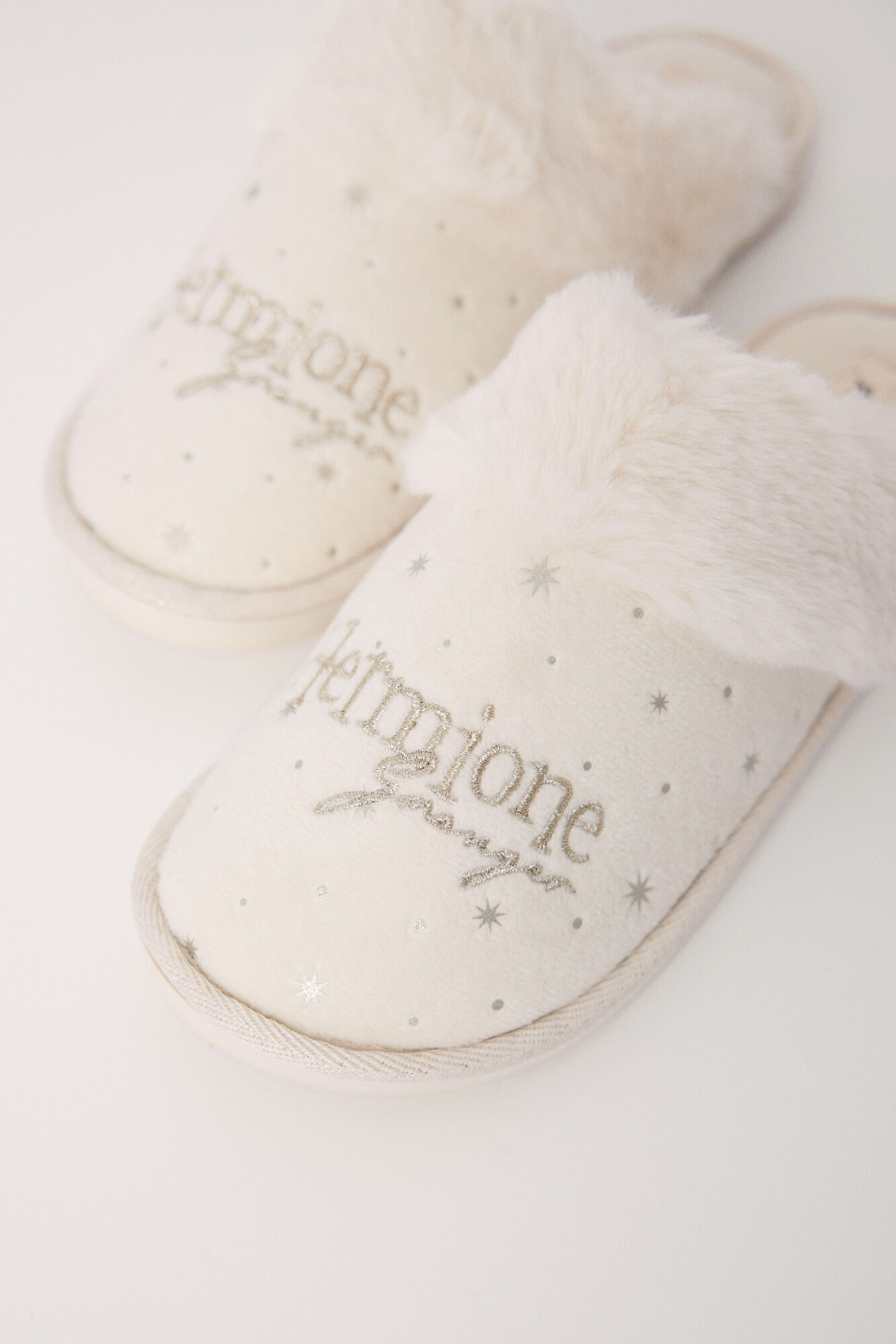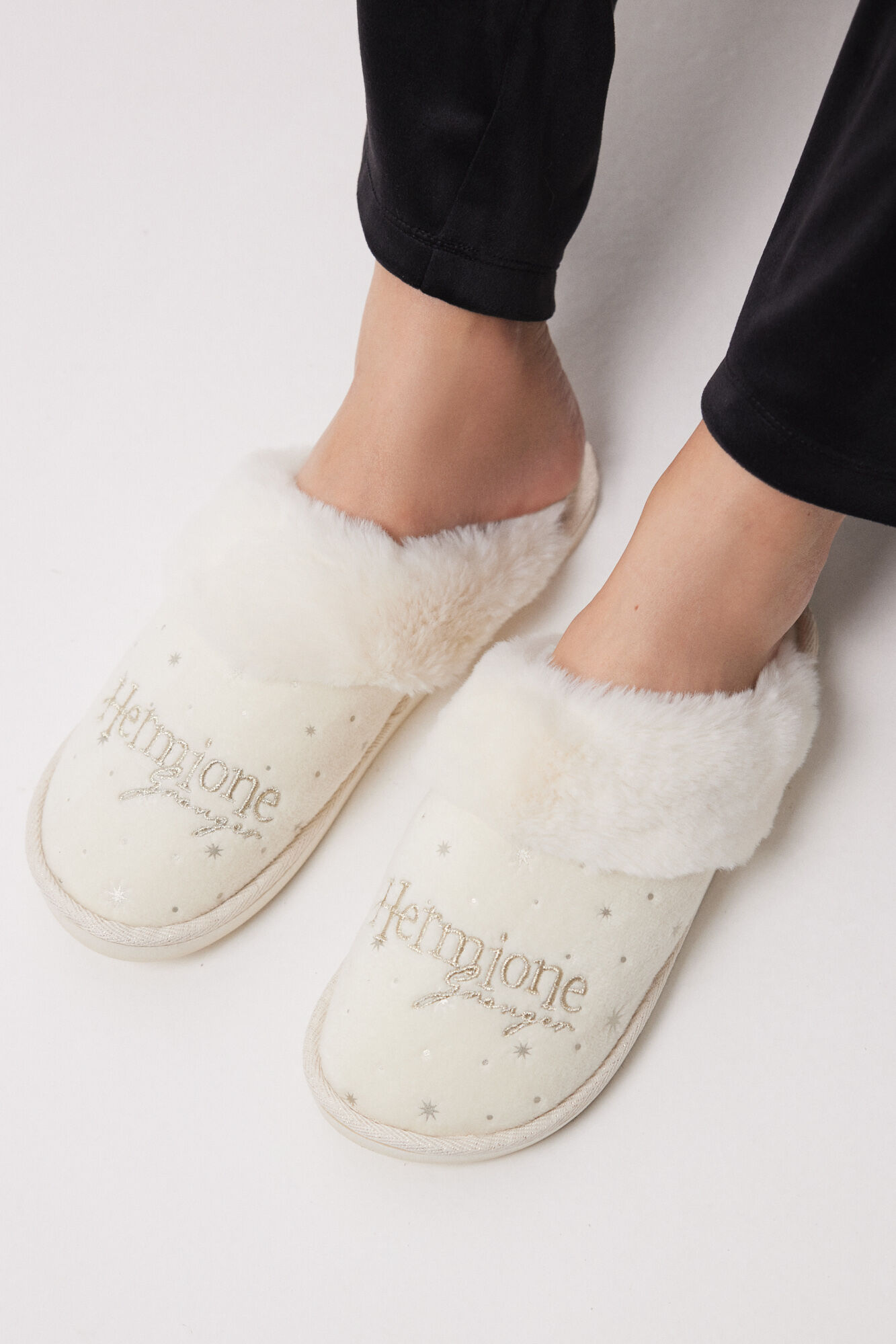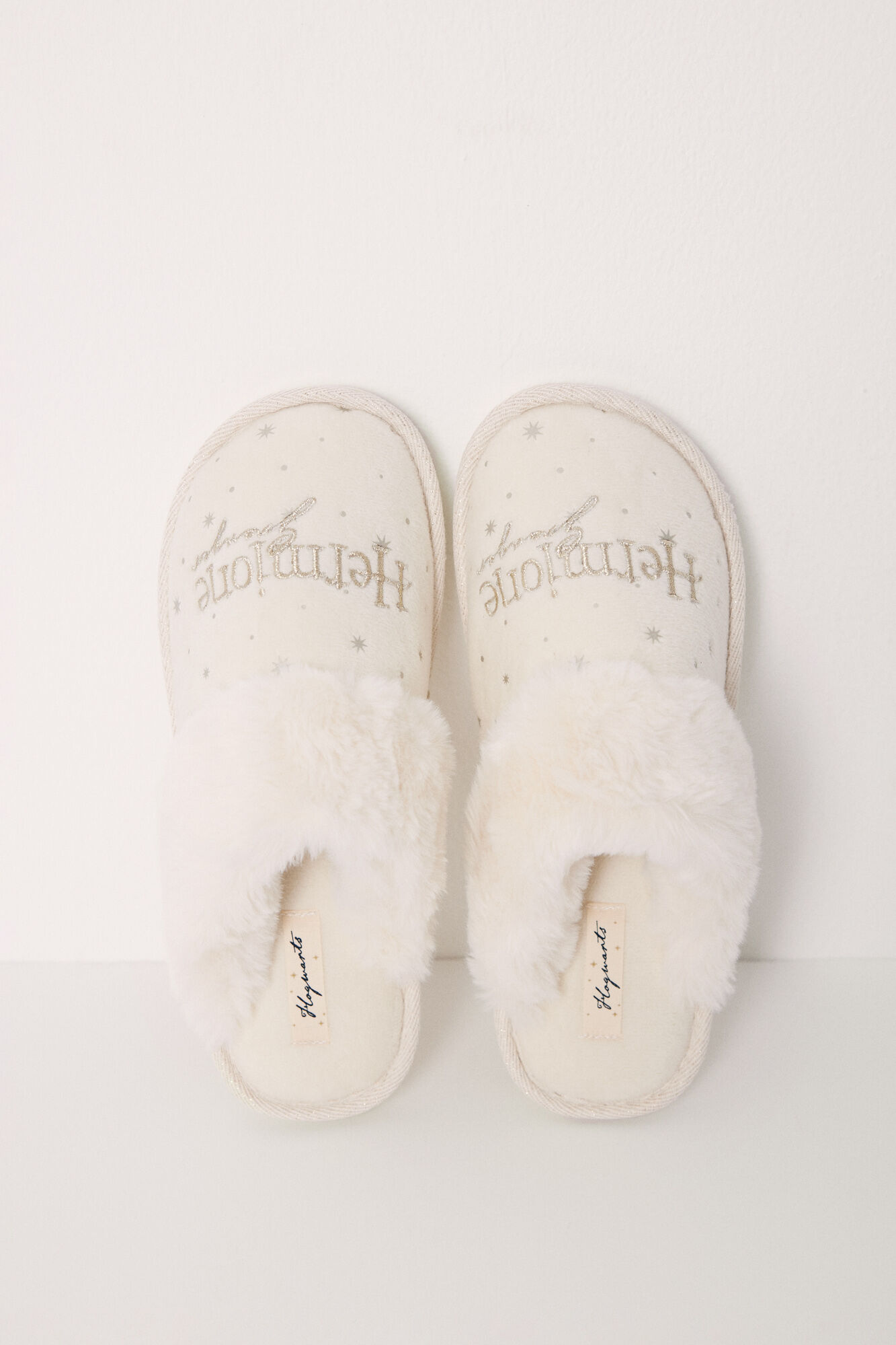 Closed, backless slippers in ivory with Hermione embroidered and faux fabric detail. Very warm, perfect for this season. Maximum quality on your feet! Combine them with their matching pyjamas and toiletry vanity case .