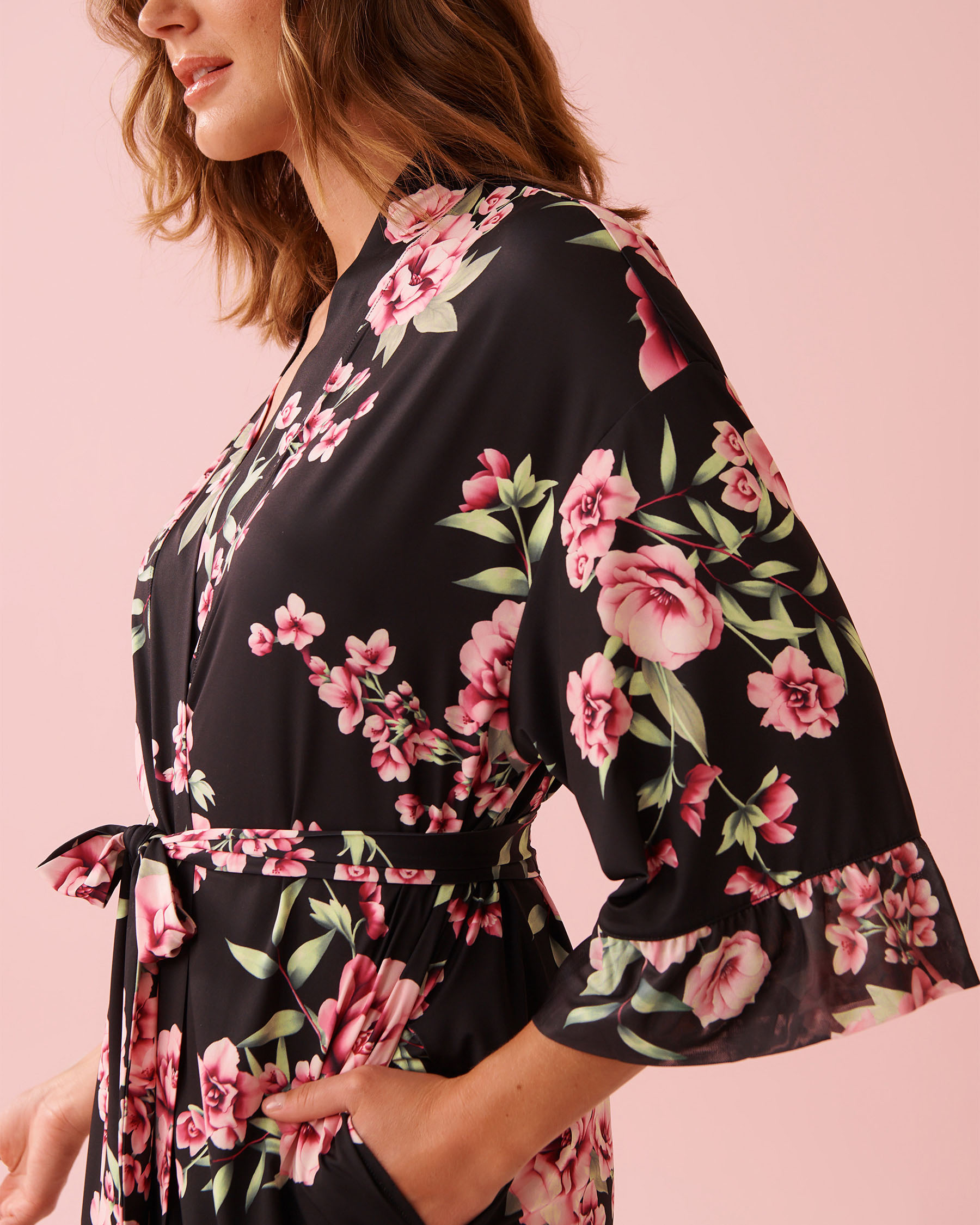 3/4 sleeves|Adjustable belt at waist|Side pockets|Ruffled mesh trim|Knee length|Made from recycled fibers|Michèle wears a size S|90% Polyester 10% Elastane