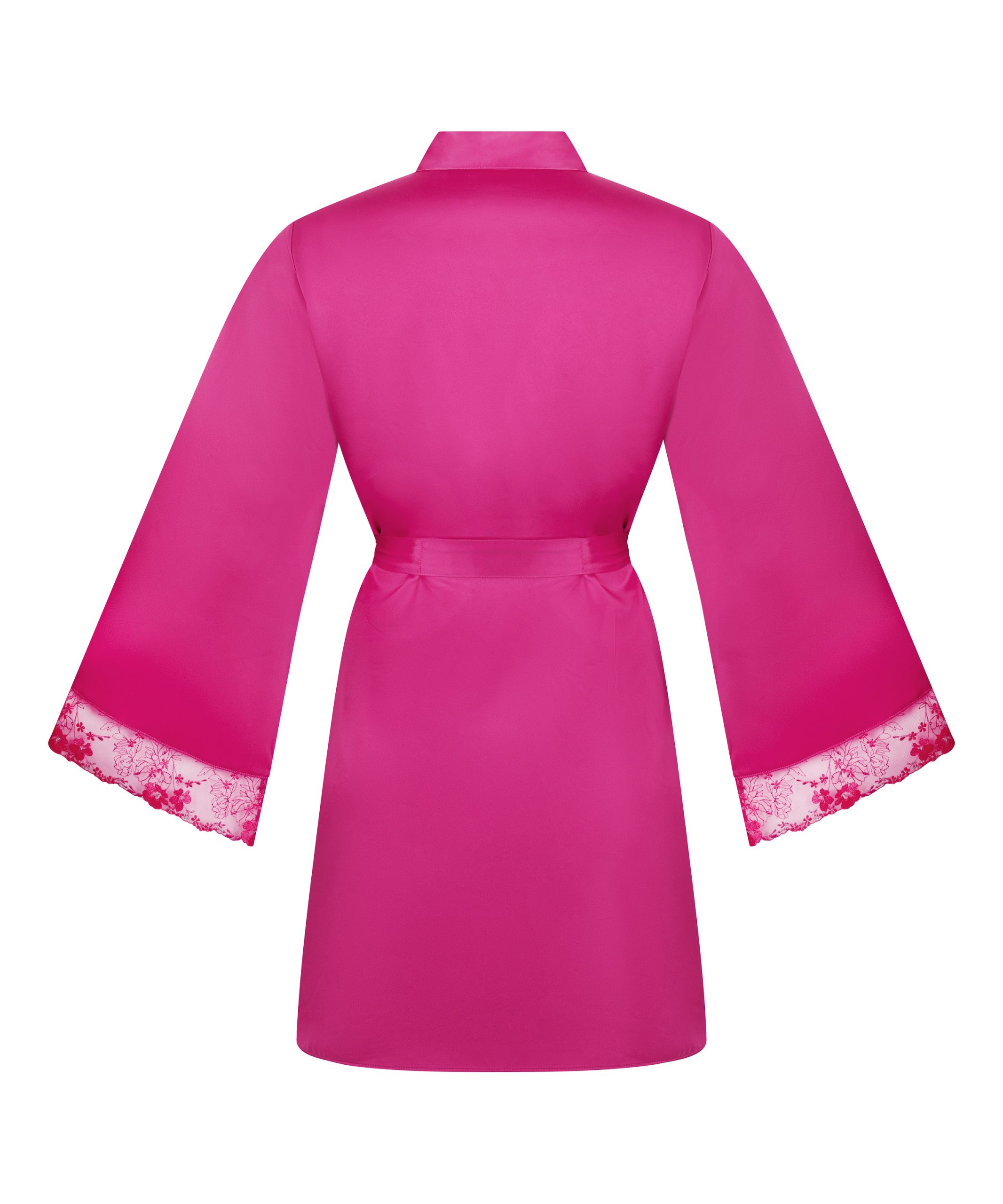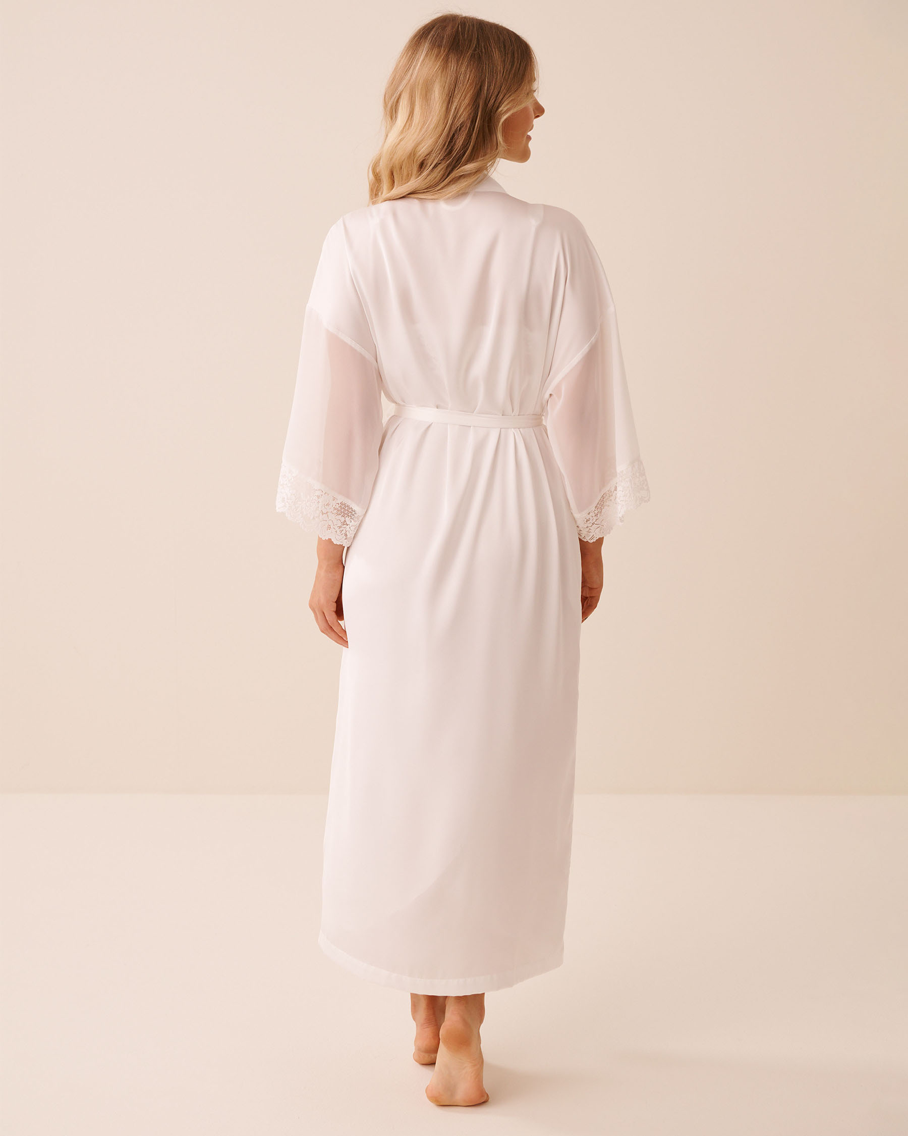 Step into softness with this long satin kimono, adorned with delicate floral embroidery lace at the sleeve ends. Its flowing silhouette and silky texture bring effortless elegance to your loungewear. Perfect for layering over your favorite slipdress or lingerie.