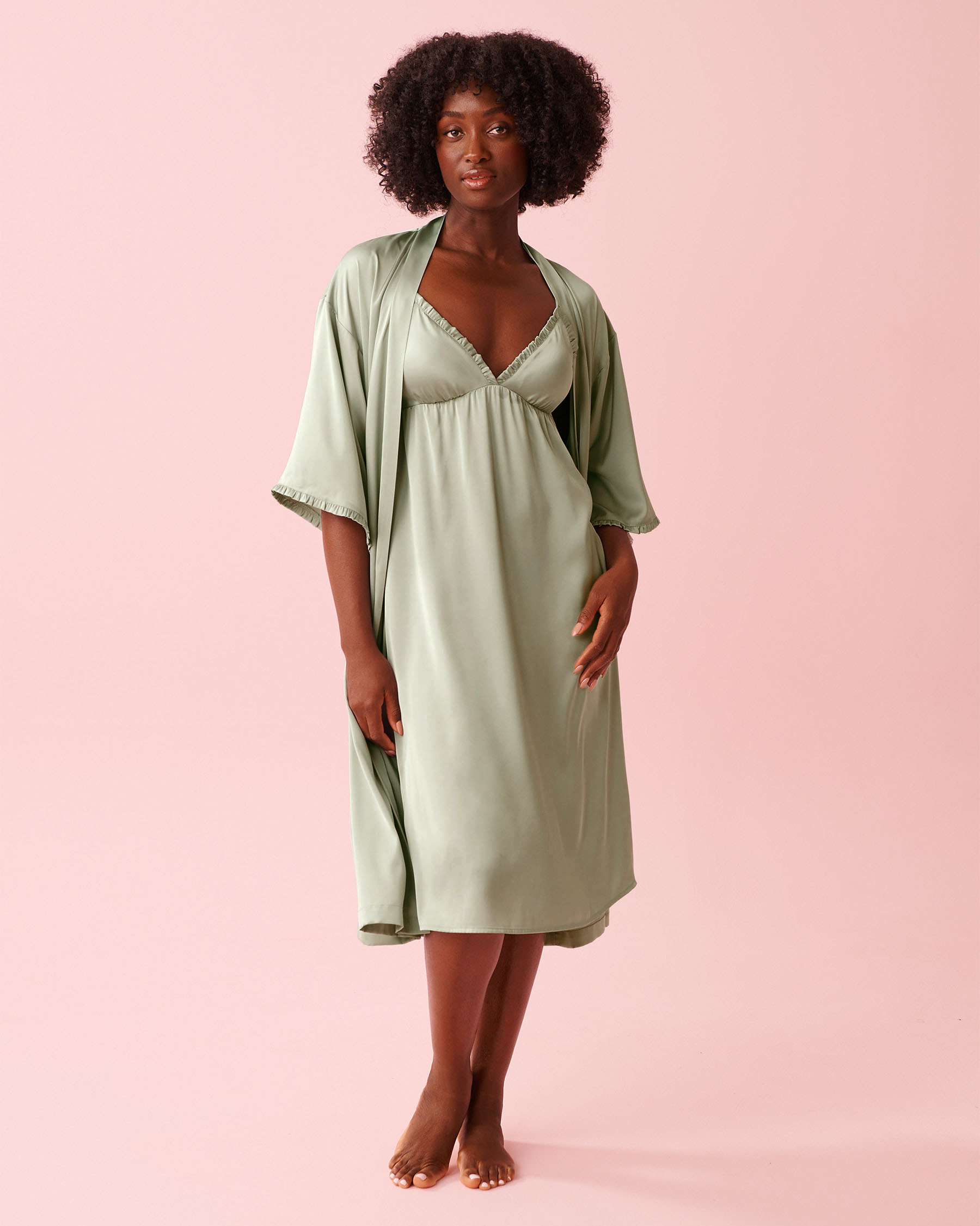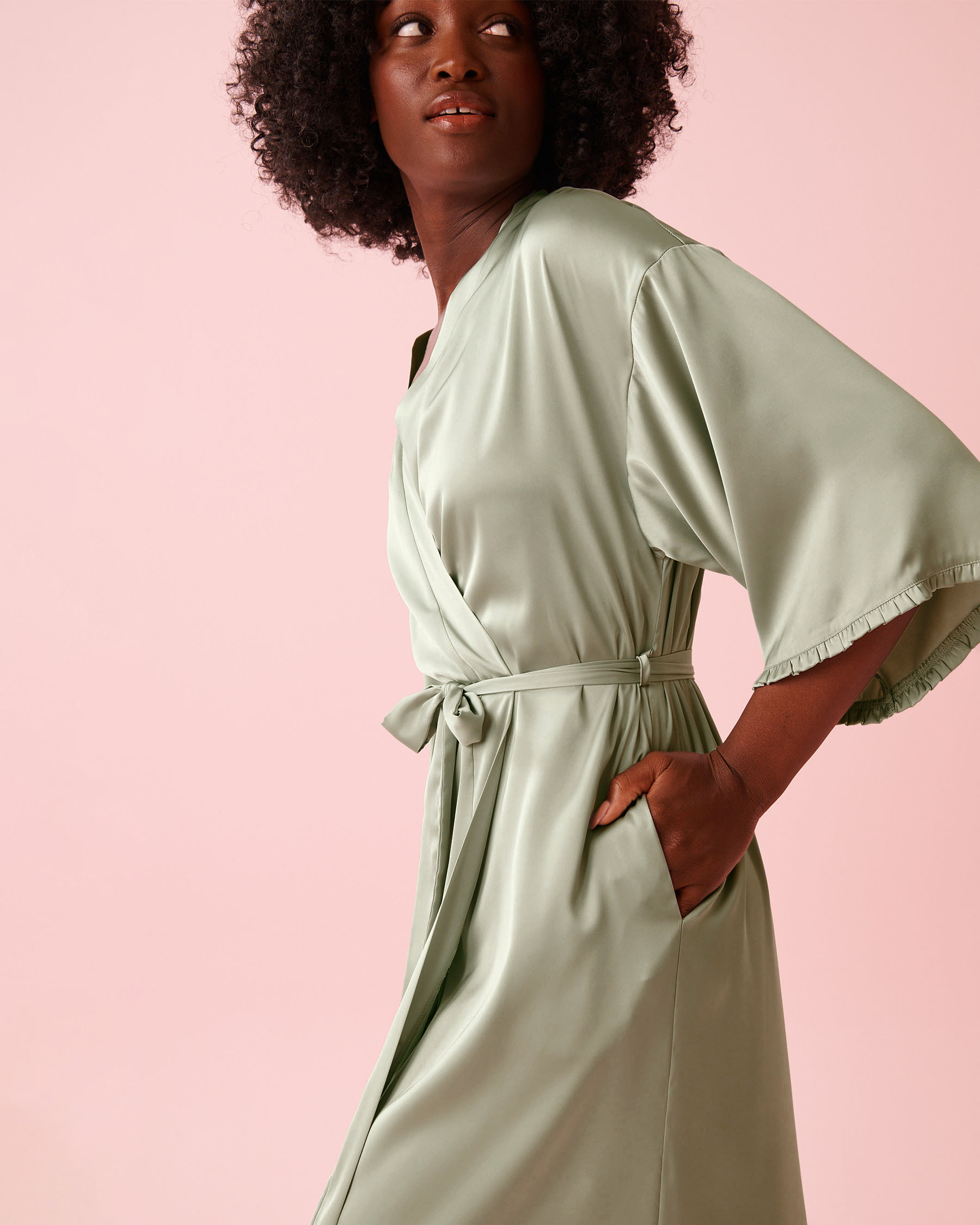 3/4 loose sleeves|Adjustable belt at waist|Side pockets|Mid-calf length|Ayé wears a size S|96% Polyester 4% Elastane