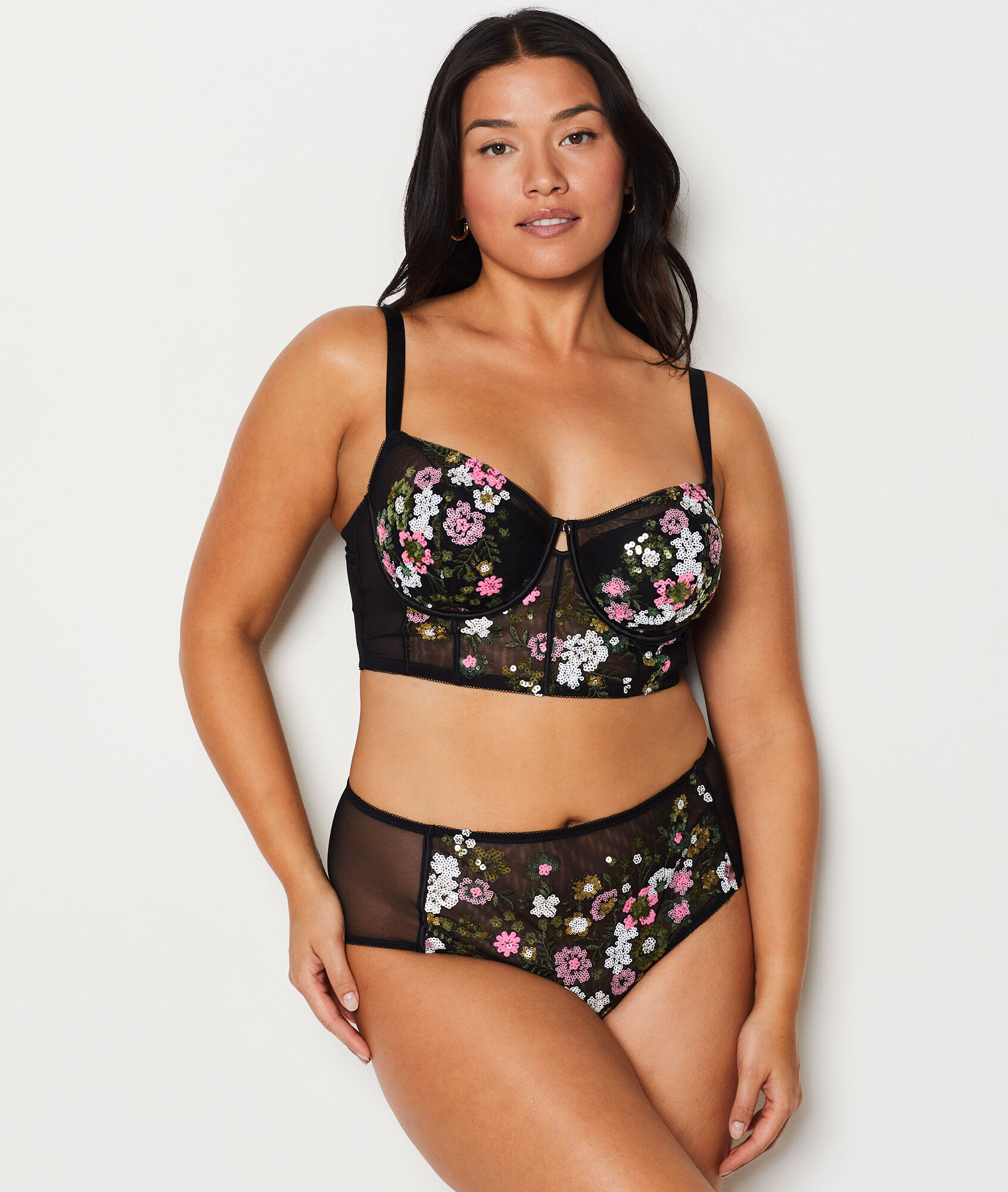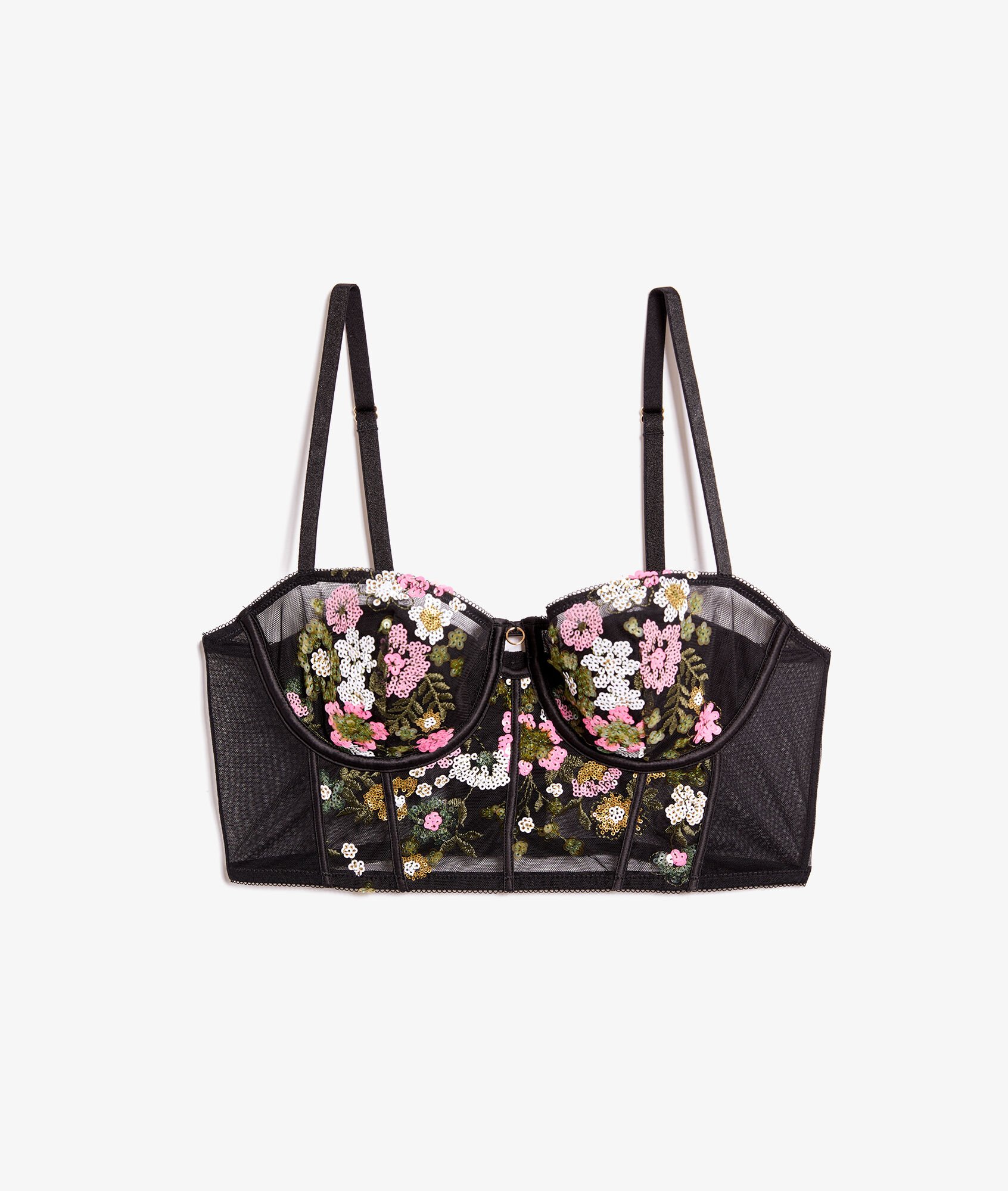 Spectacular embroidery features on this delicate and sensual lingerie. Colorful sequins craft contrasting flowers on a backdrop of intense black tulle, revealing a subtle interplay of transparency with the skin.The bustier is the centerpiece, embodying t