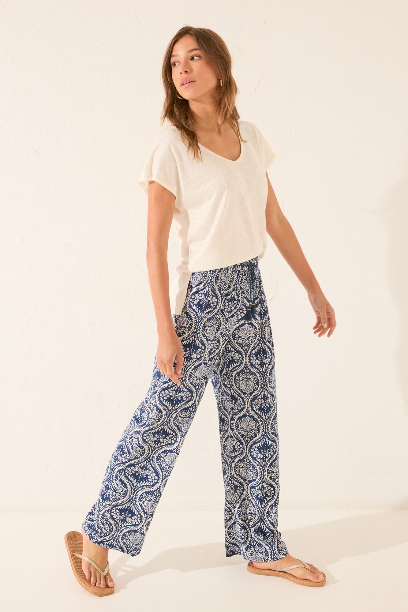 Long viscose trouser with an allover print . Super lightweight, perfect for wearing at home or for your street, beach, or pool looks. With an adjustable elastic waistband with a drawstring and matching tassels . Pair it with your favorite top