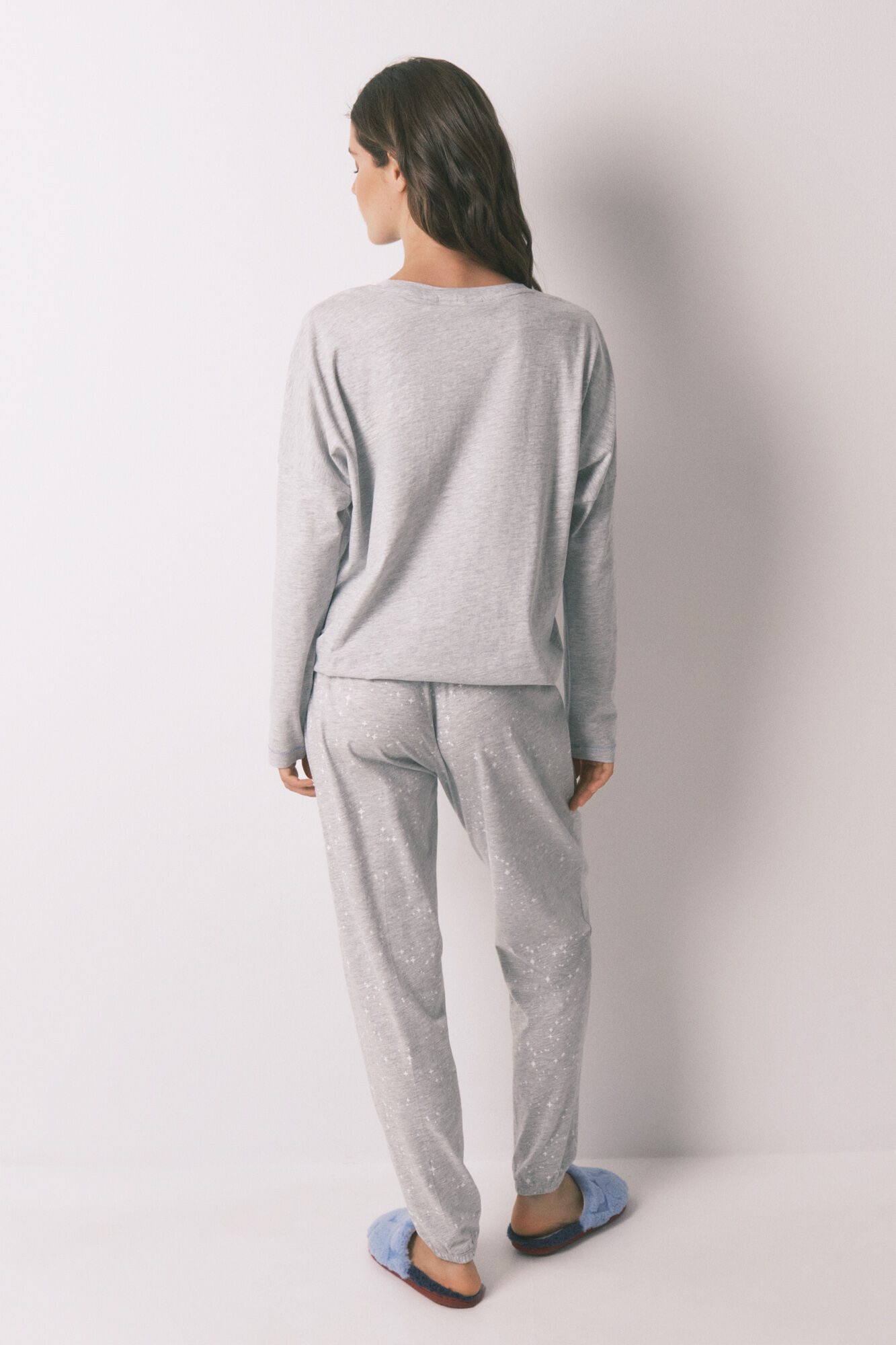 Sleeve and long- trouser pyjamas in cotton fabric . Plain top with a central Hedwig positional print , open round neck , dropped sleeve with cuffs and a contrasting adjustable waistband . Skinny trouser with an allover star print , wide elastic waistband