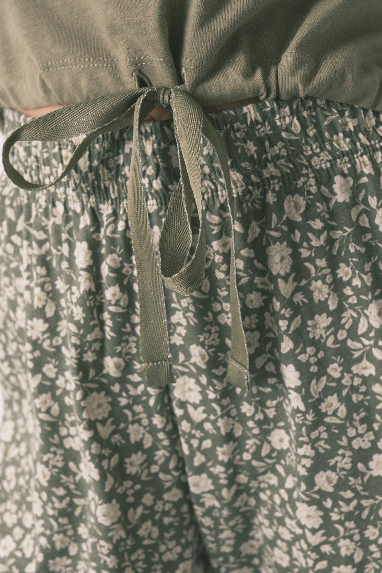 Long-sleeved pajamas with long pants made from 100% cotton. The top features a round neckline, dropped sleeves, a Smiley face print, and a matching drawstring waistband. The pants feature an allover floral print and elastic waistband.