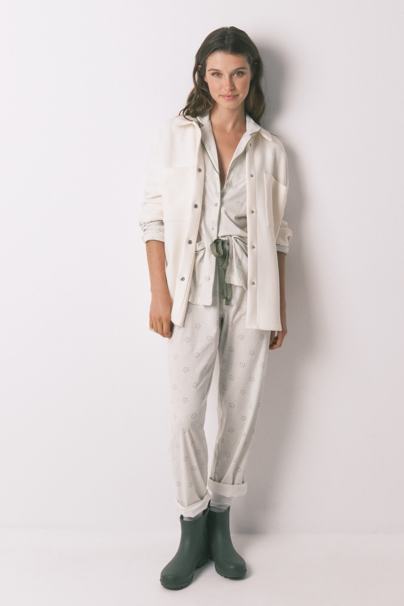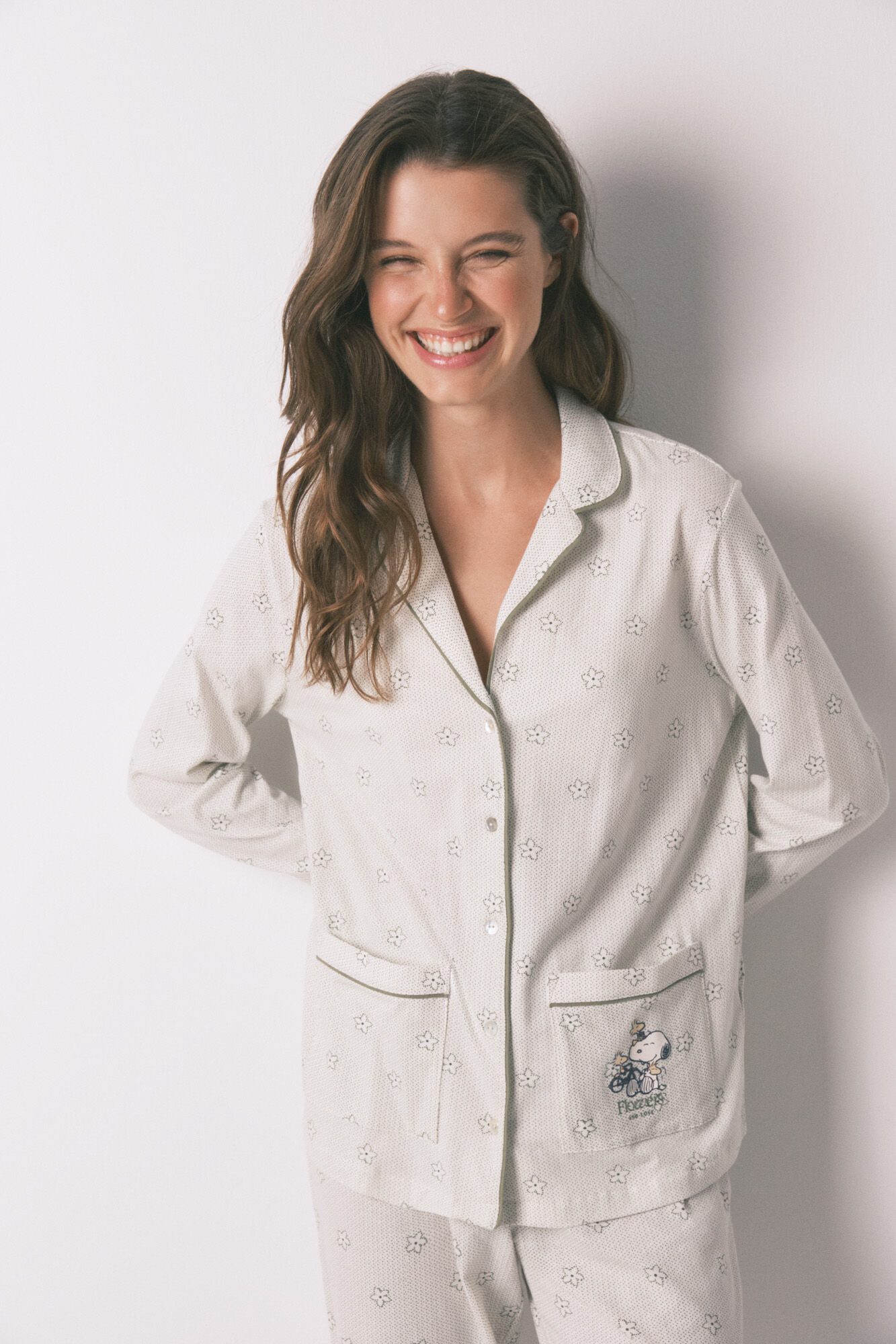 Long-sleeved shirt and pants pajamas with an allover floral print made from 100% cotton. The top features a shirt collar and matching buttons, contrasting piping details, and two front patch pockets with a Snoopy positional print. Lounge pants with an ela