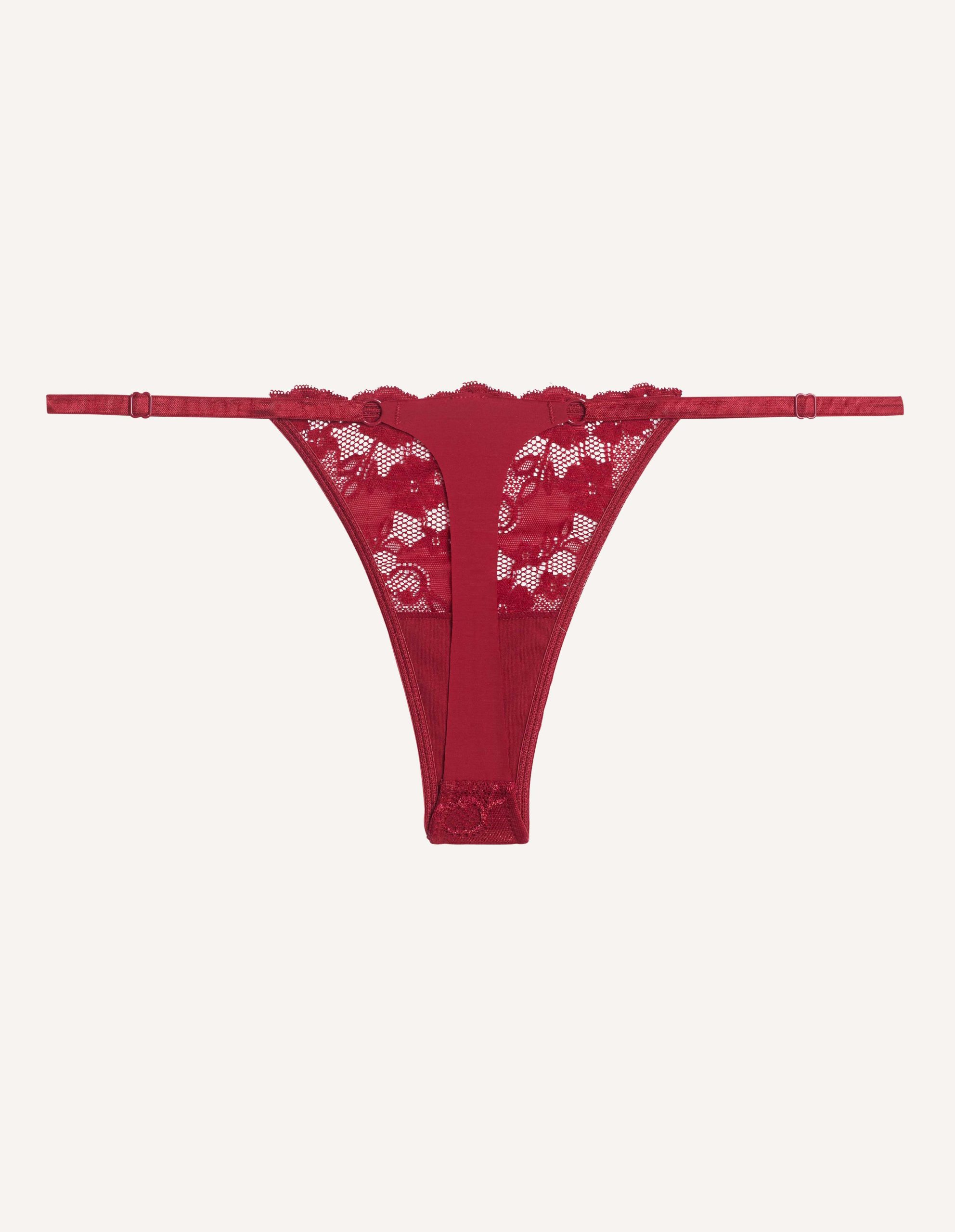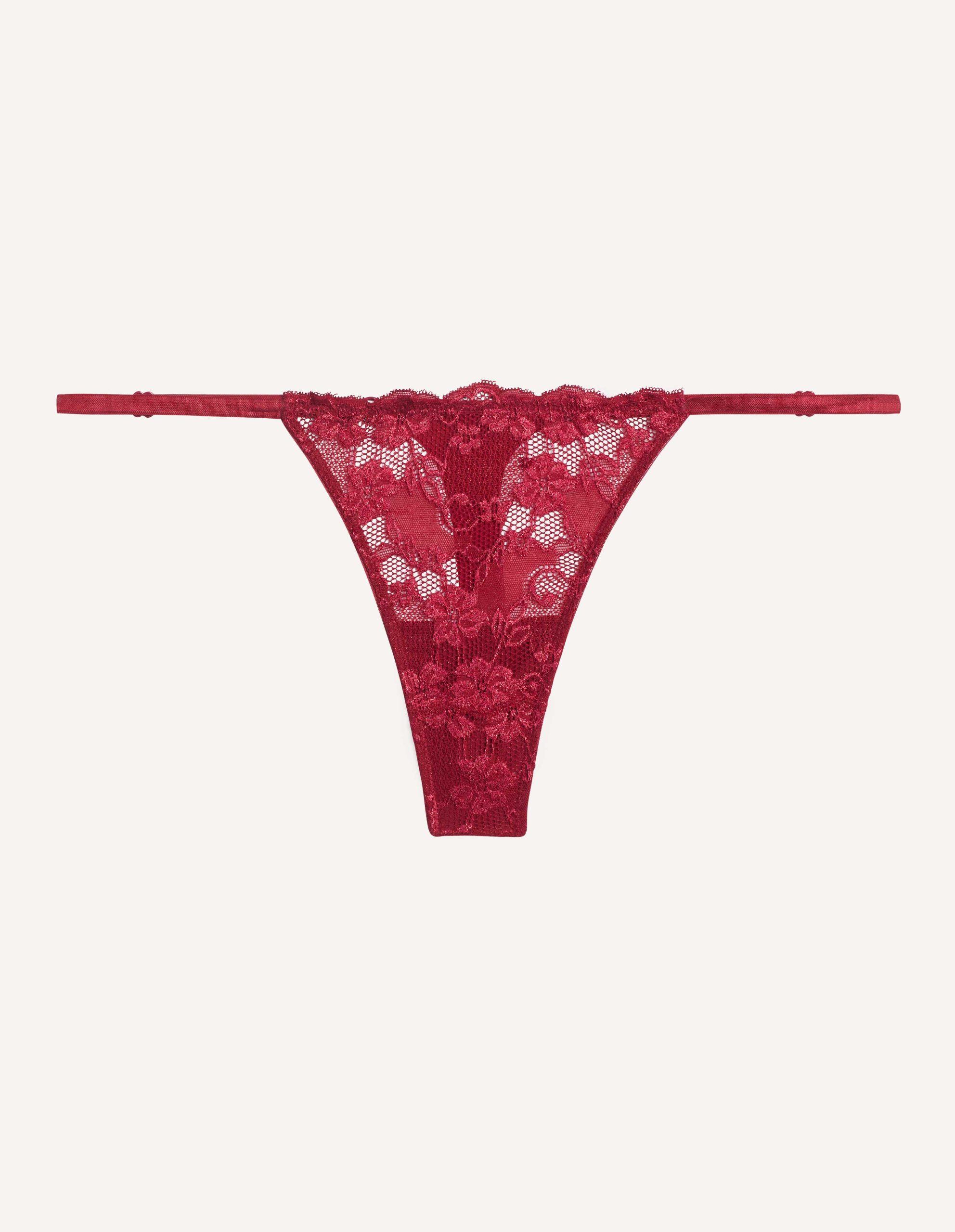 -69%Low-Rise Thong in elegant and fine laminated lace. Modern and sensual ruby red. The back string gusset made of delicate raw-cut microfiber does not mark and improves fit. Practical and thin adjustable side straps.