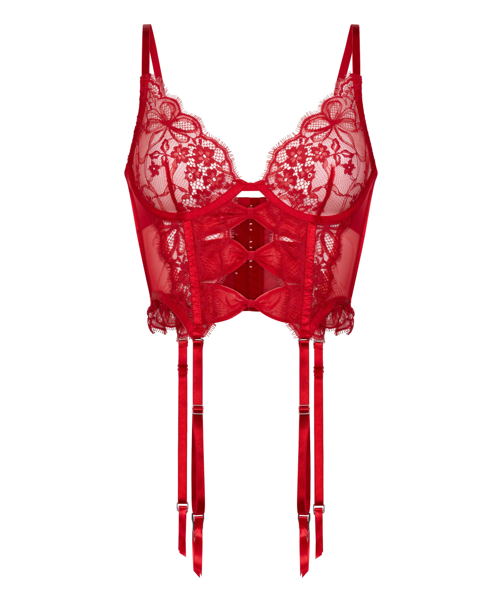 Celebrate the season in style with this mesh lace bustier corset, featuring delicate underwire support and adjustable straps for the perfect fit. Unpadded for a natural look, its structured silhouette is adorned with sweet bow details for a festive, flirty touch. The sheer lace adds elegance while keeping it playful and cute. Ideal for holiday nights or gifting yourself something special. A charming must-have for your Christmas lingerie collection!