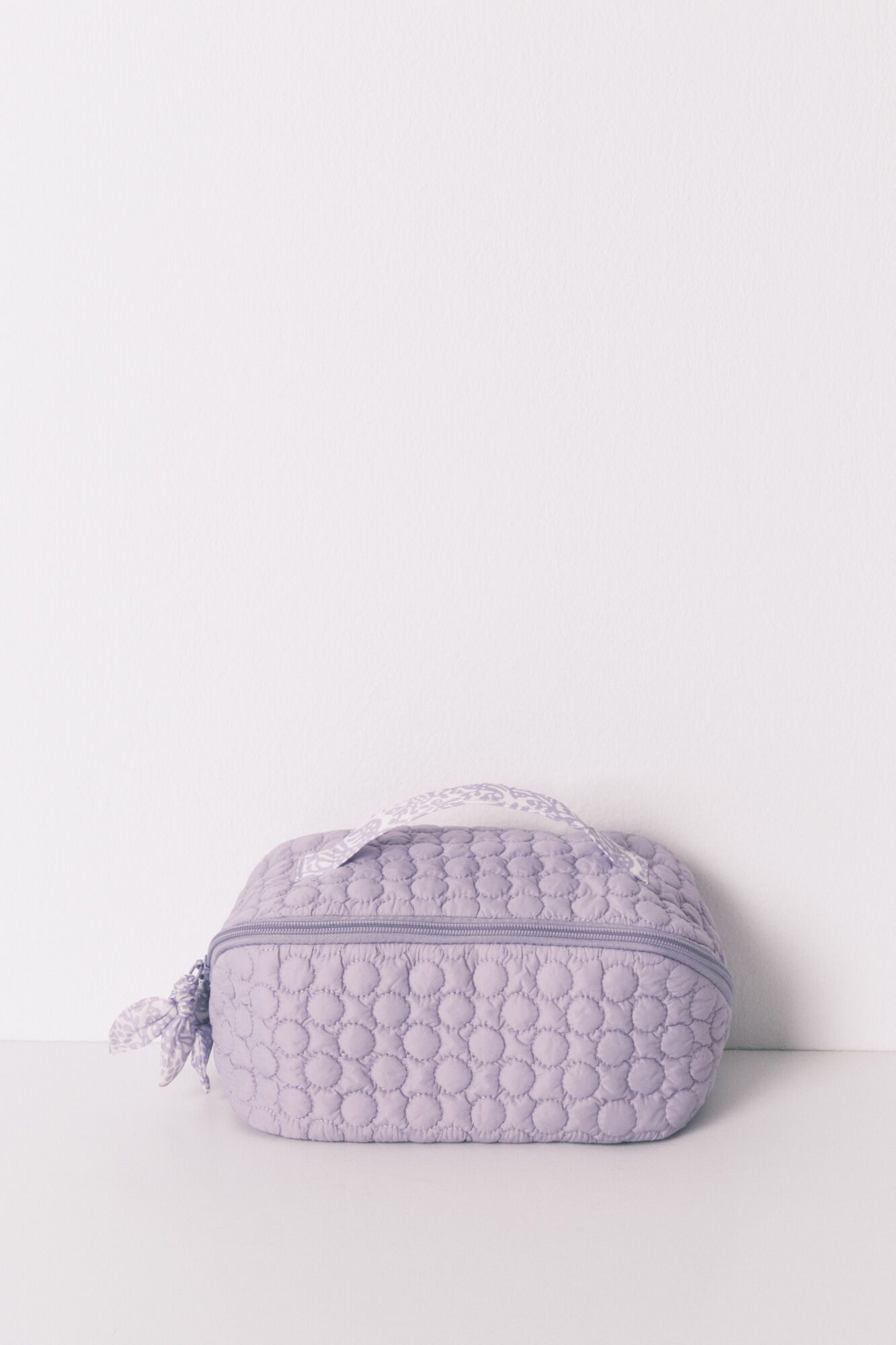 Medium vanity case with puffer nylon texture. Lilac color and print pullover. Ideal for organizing your daily accessories . Match it with an accessory from the collection. Measurements: 11 x 24 x 11 cm.