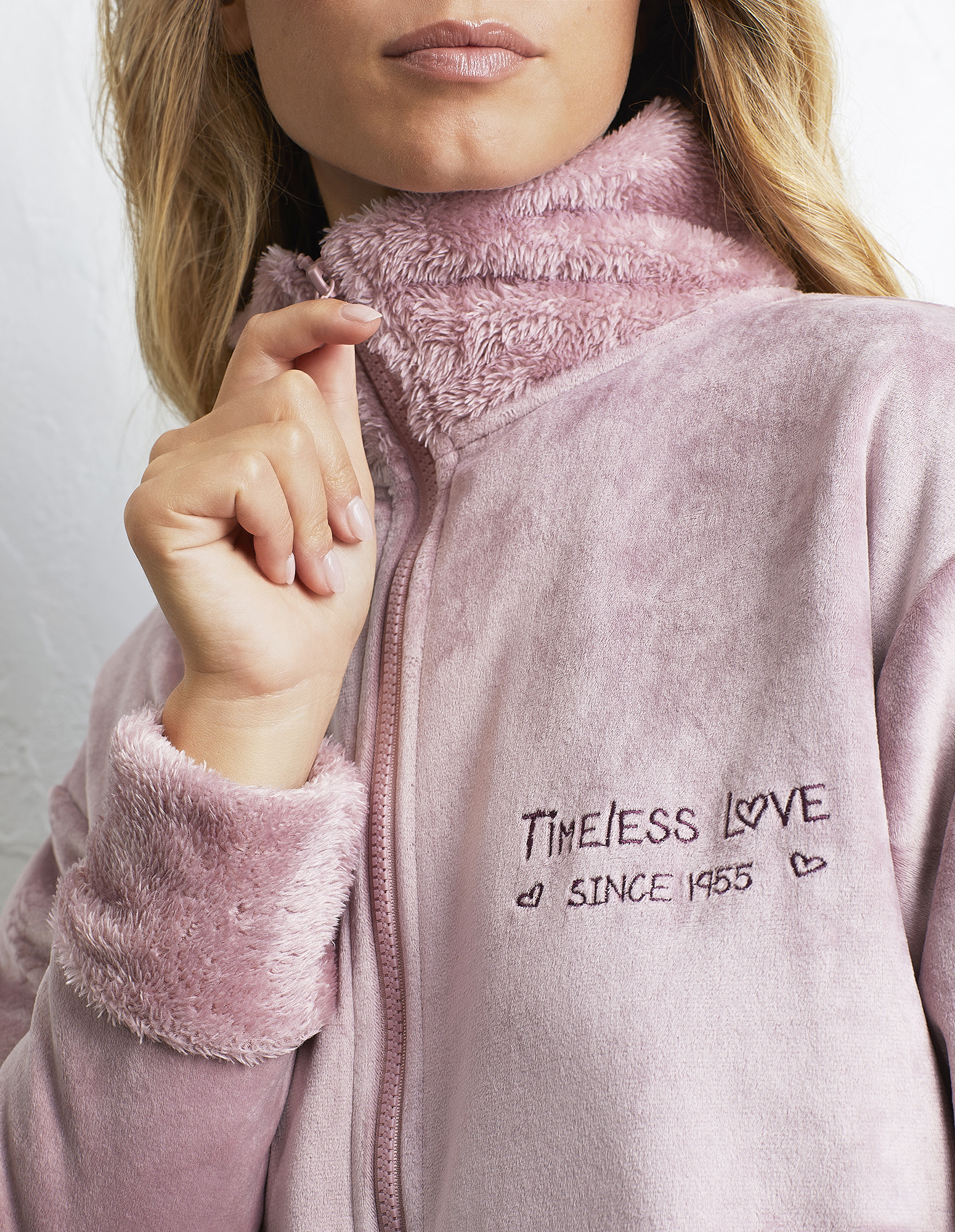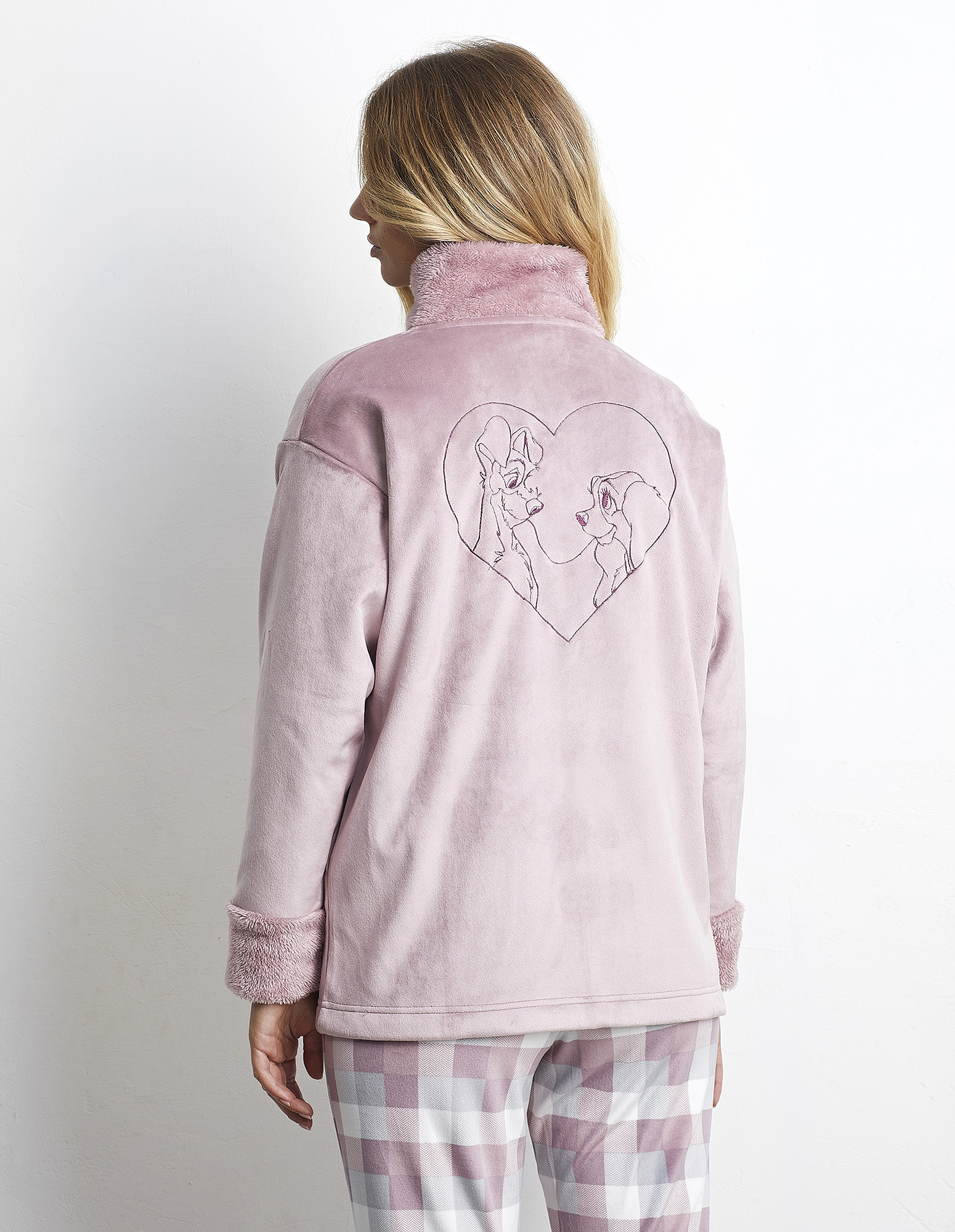 Discover comfort and elegance with our home sweatshirt inspired by “Lady and the Tramp”. Made with a soft and warm fabric, in an elegant pink clay color, this sweatshirt is embellished with a high neck, a practical central zip and large side pockets. A ga