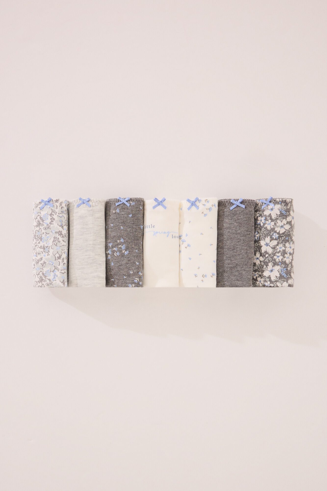 -69%Pack of 7 classic cotton panties , with prints in shades of grey and blue, and blue bow or tie detail. Perfect for the whole week. Combine them with the top you like the most to show off the complete set (or outfit). Only exchanges or returns with s