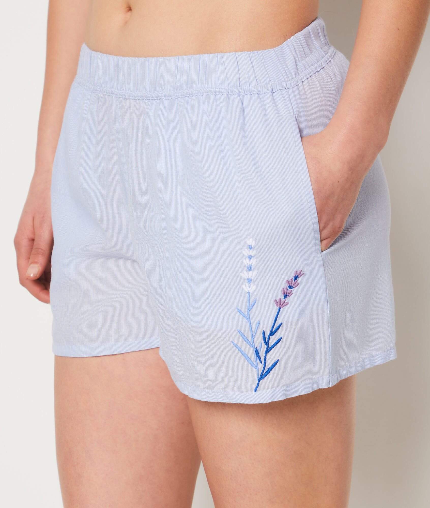 breath of fresh air sweeps through these pajama shorts. Featuring an elastic waistband and pockets, lovely embroidery with poetic accents adorn its cotton fabric.
