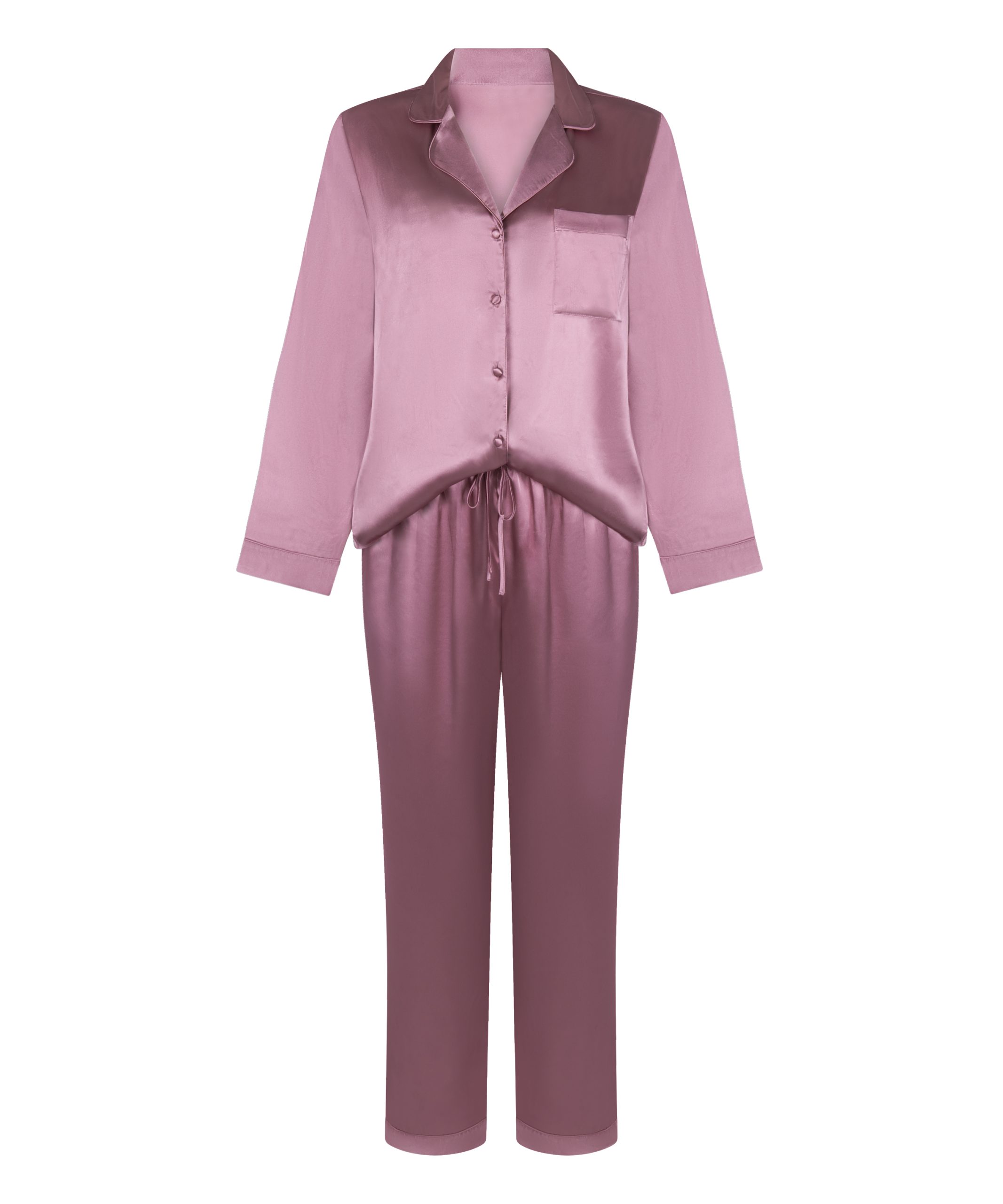 Dreaming about elegance? Slip into it with this satin pyjama set, featuring a soft jersey button-down top and flowy wide-leg pants. The elastic waistband ensures all-night comfort, while the glossy satin finish adds a touch of glam. Perfect for cozy nights or girly sleepovers, this set blends style and softness effortlessly. Pair it with your favourite lingerie set! Your new favorite bedtime look is just a button away!