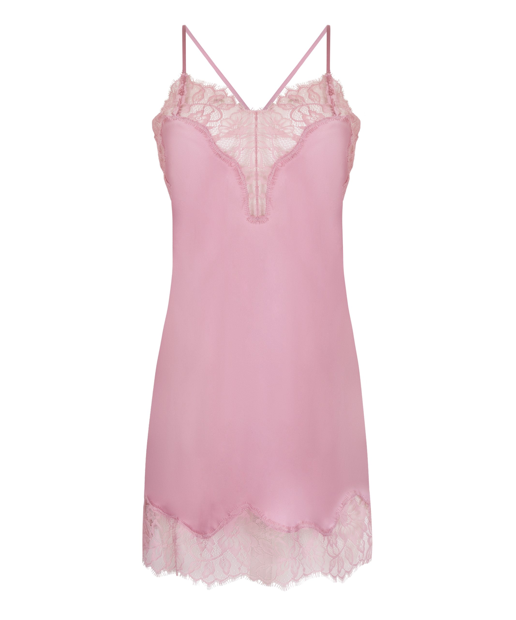 This slip dress is a must-have for your elegant collection! It is made of satin, has a beautiful v-neck and contains beautiful lace details. Combine with a matching kimono for a complete look. Part of the Noir collection.
