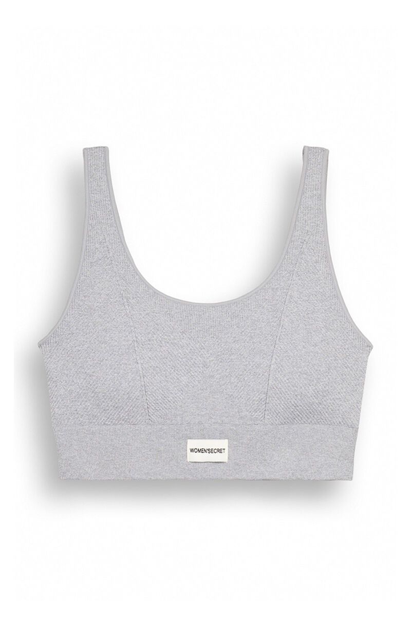 Crop top with ribbed texture in gray, seamless type. With removable padding , round neckline and wide straps for greater support. logo label detail under the chest. Wear it as a bra or as a top. You choose! Match it with your chosen panty or pair of trous