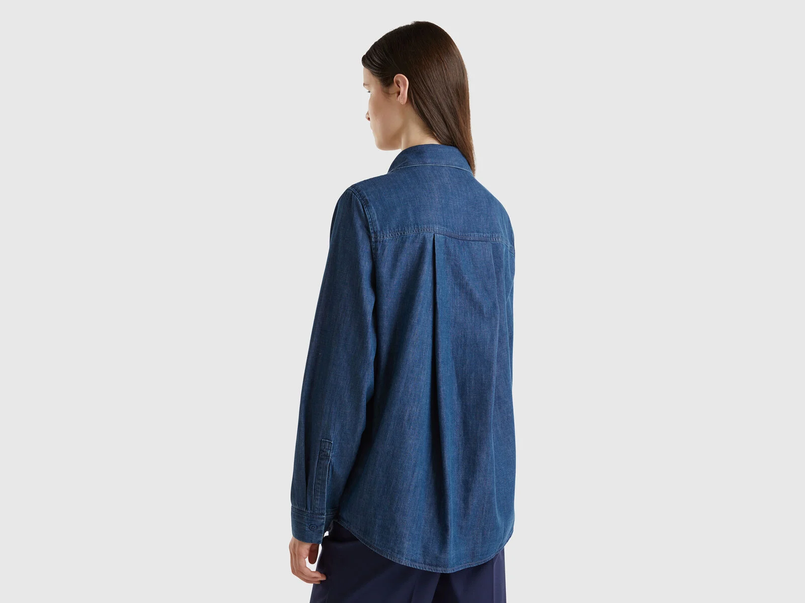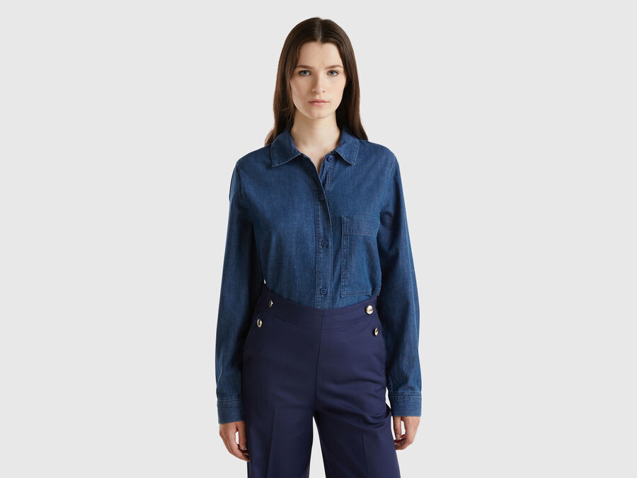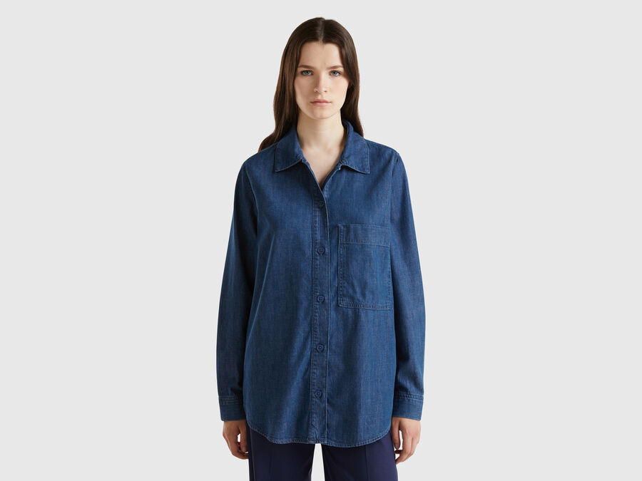 Long sleeve shirt in pure cotton chambray. Loose fit, classic collar and maxi patch pocket on the left breast. Front opening with buttons. Casual and modern, easy to pair.