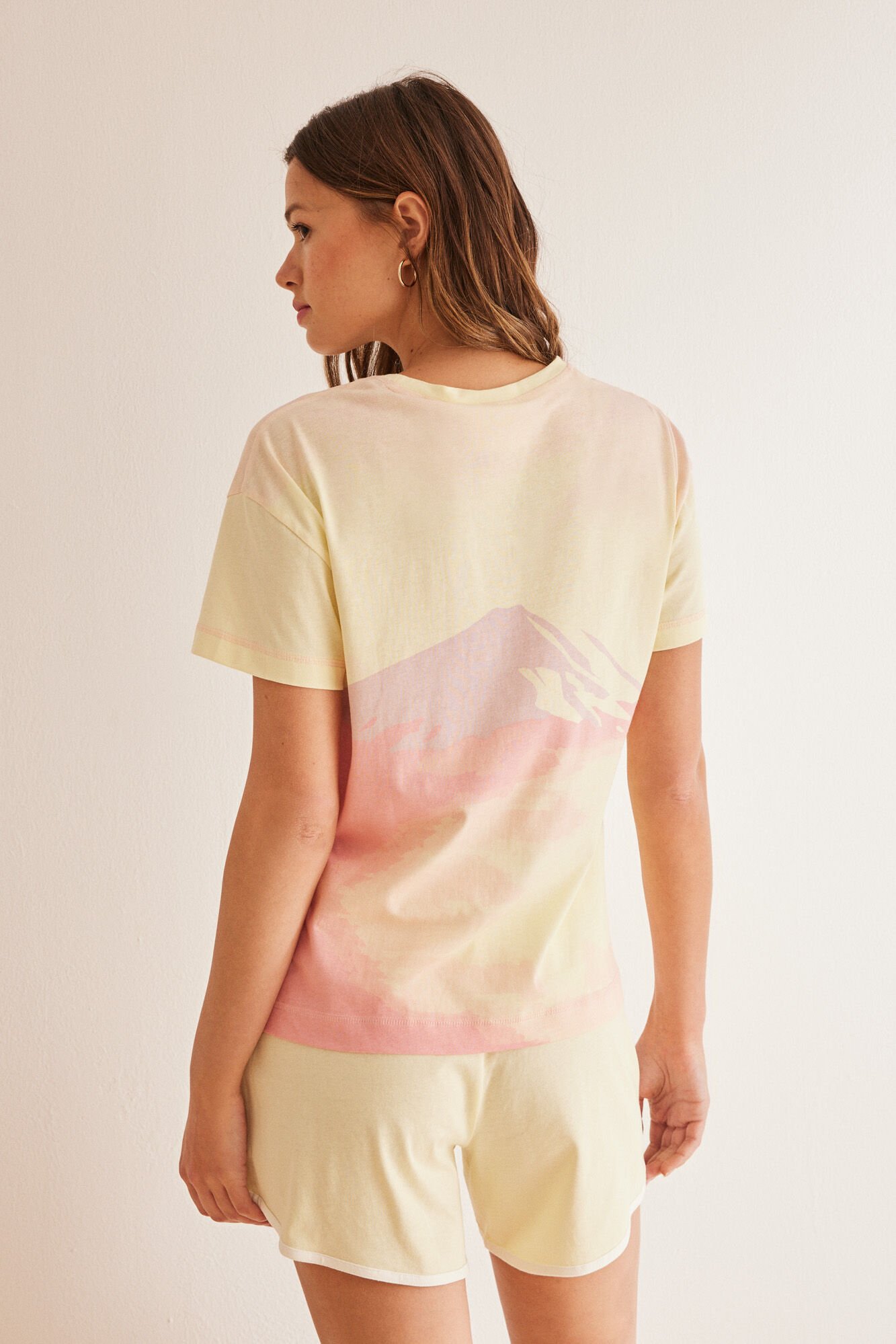 Short 100% cotton pyjamas with yellow T-shirt and shorts and pink details with a contrasting Snoopy print. It”s so practical and convenient, that you won”t want to take it off all day. Perfect for this summer! Short dropped sleeve T-shirt with round neck