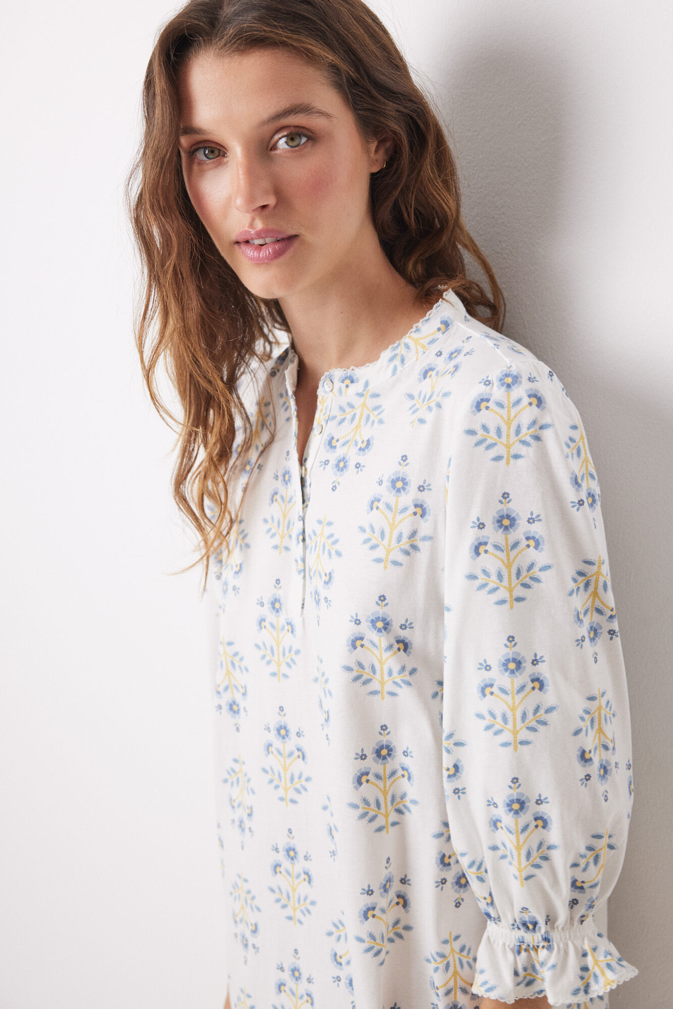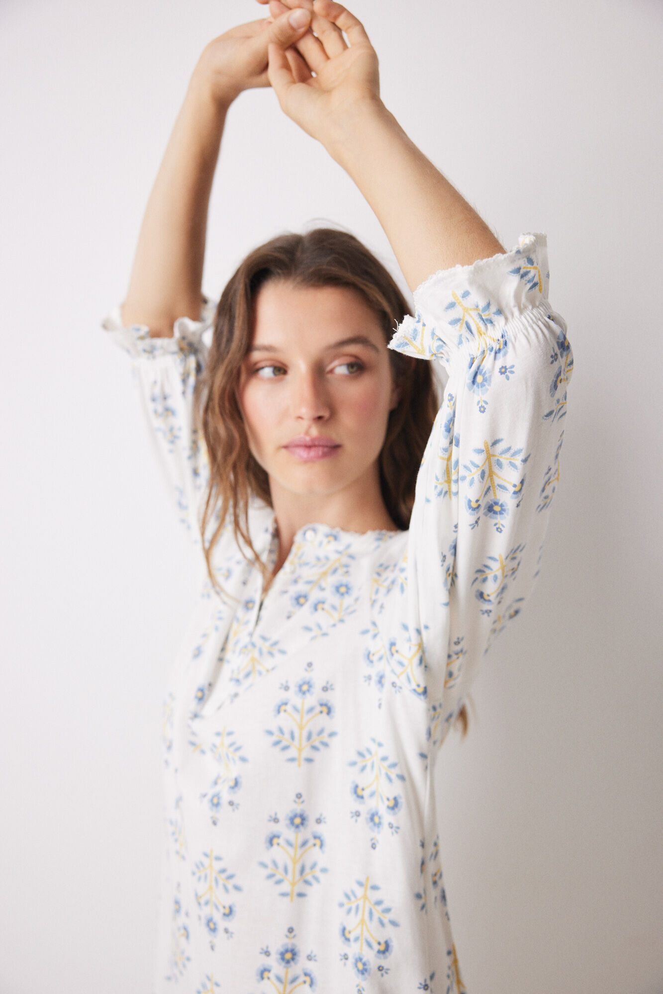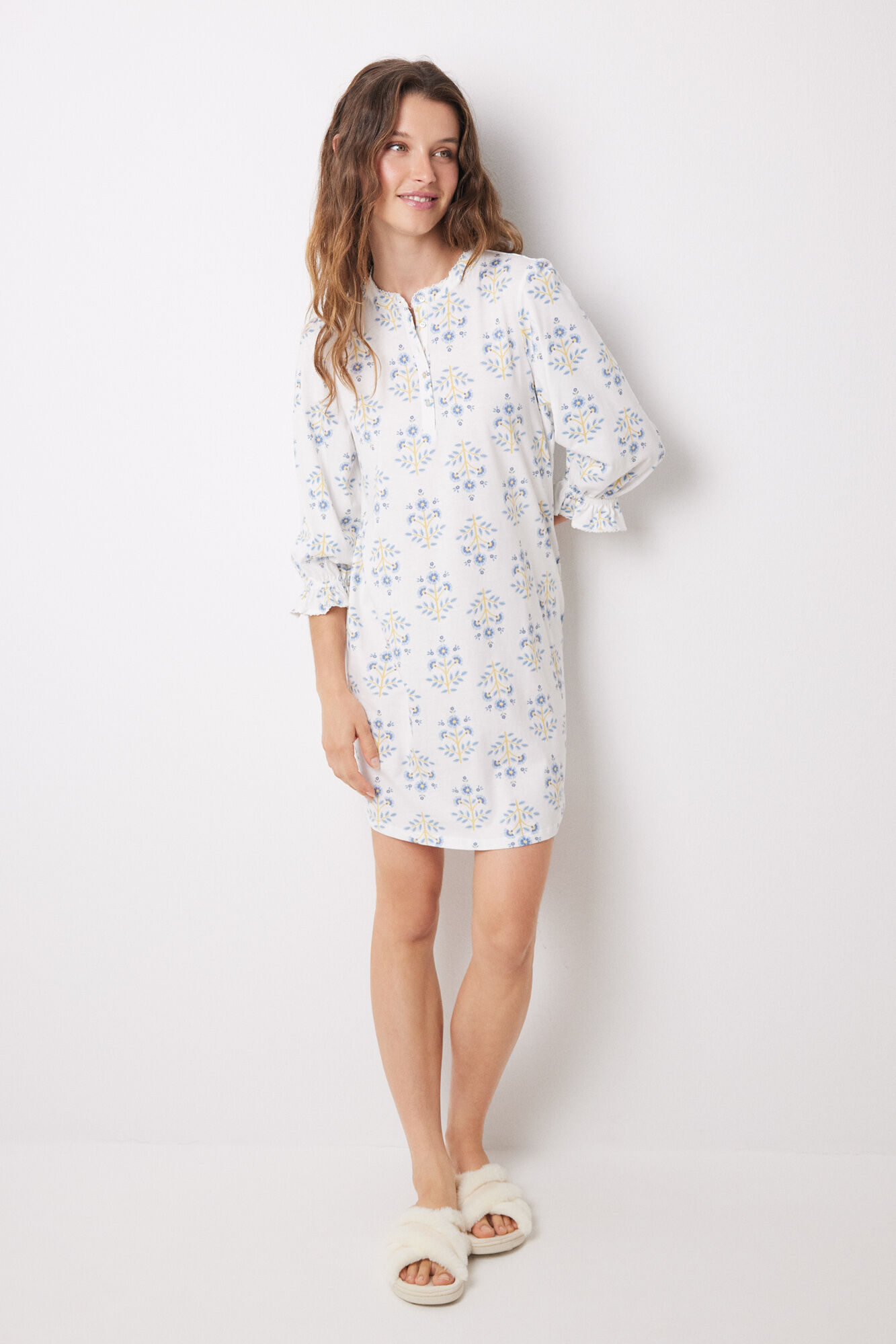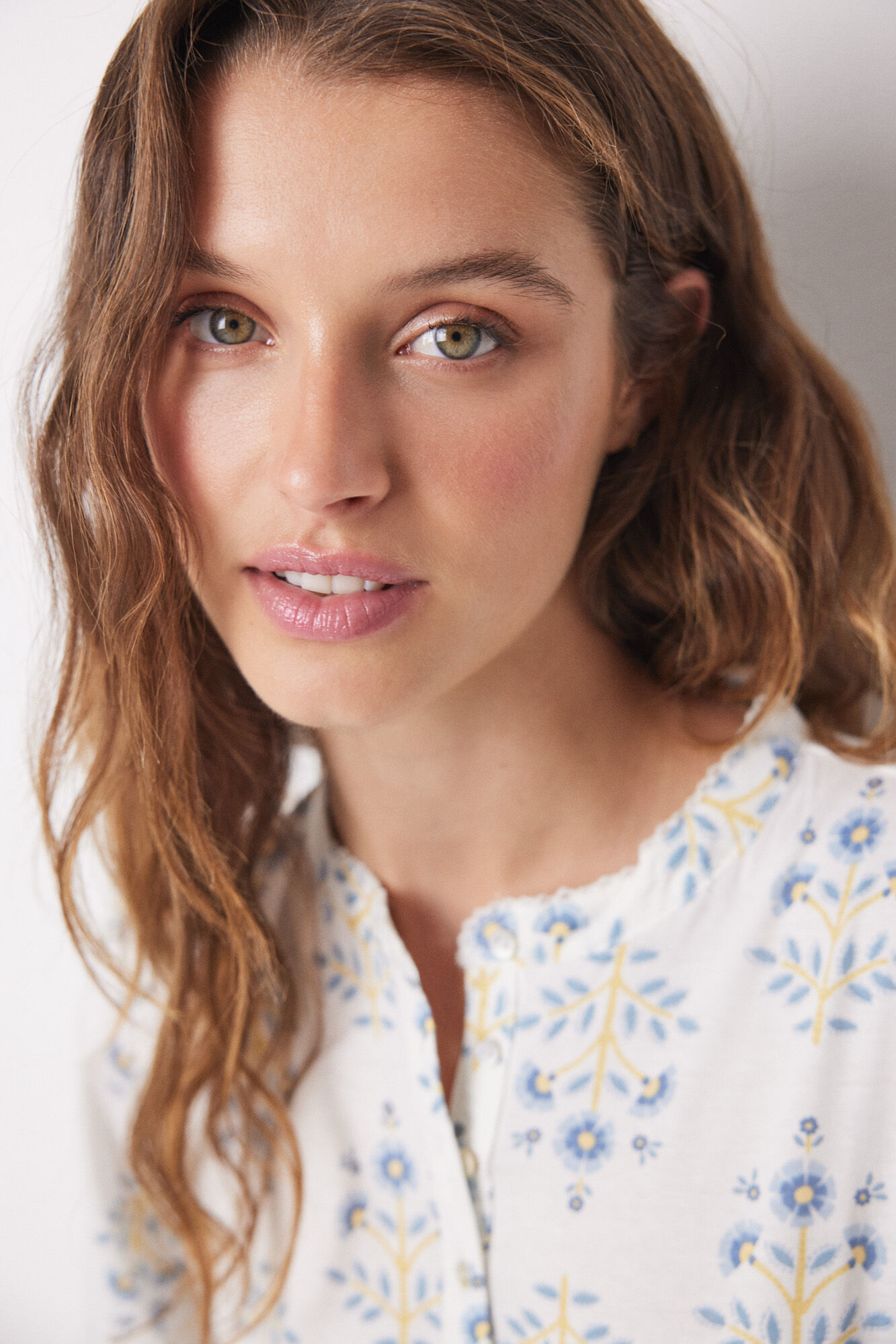 Short nightgown, made of 100% cotton fabric , in ivory color with contrasting all-over floral print . It is super comfortable and pleasant to the touch. Wear it to match accessories from the collection, and maintain your style at home too. V – neckline wi
