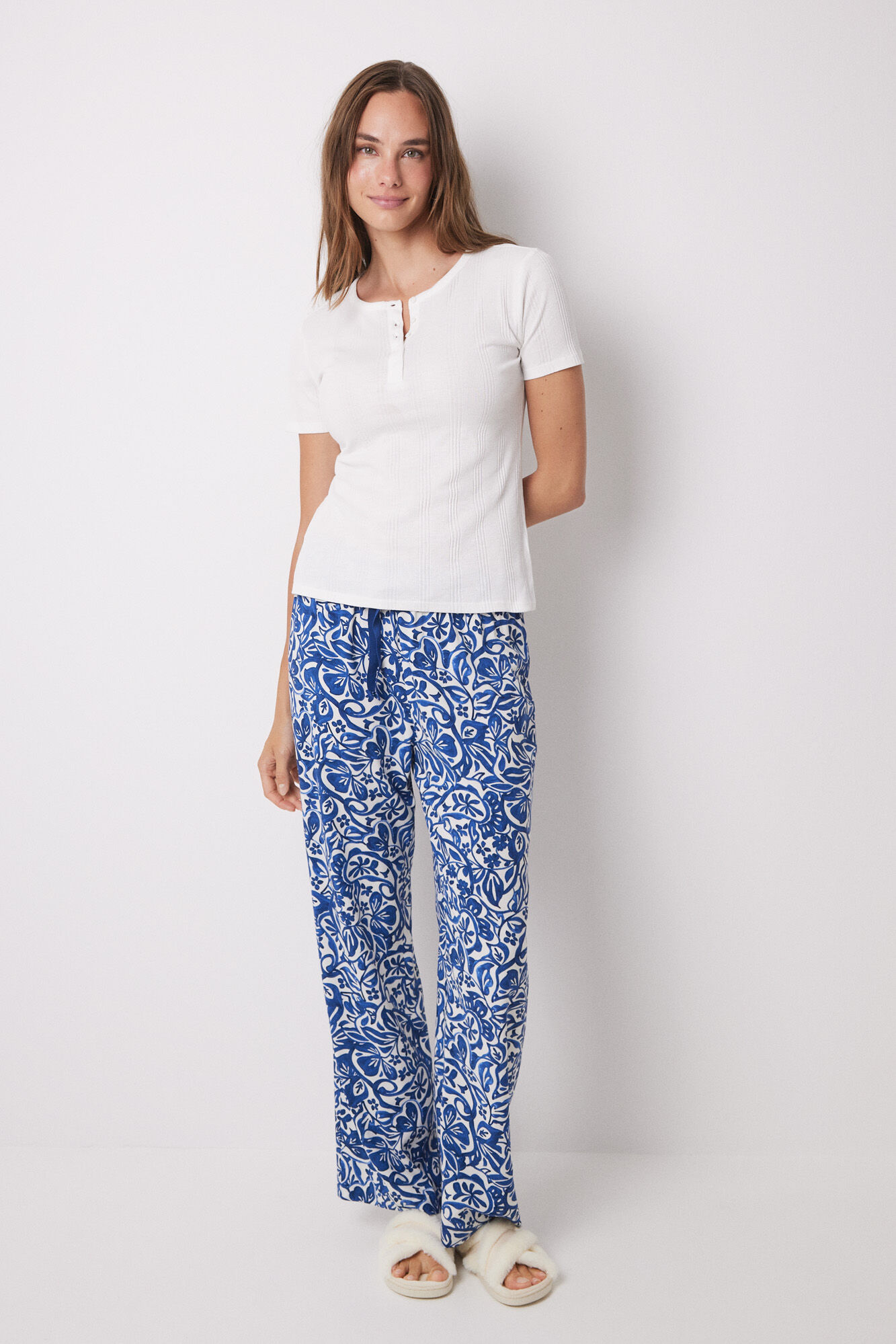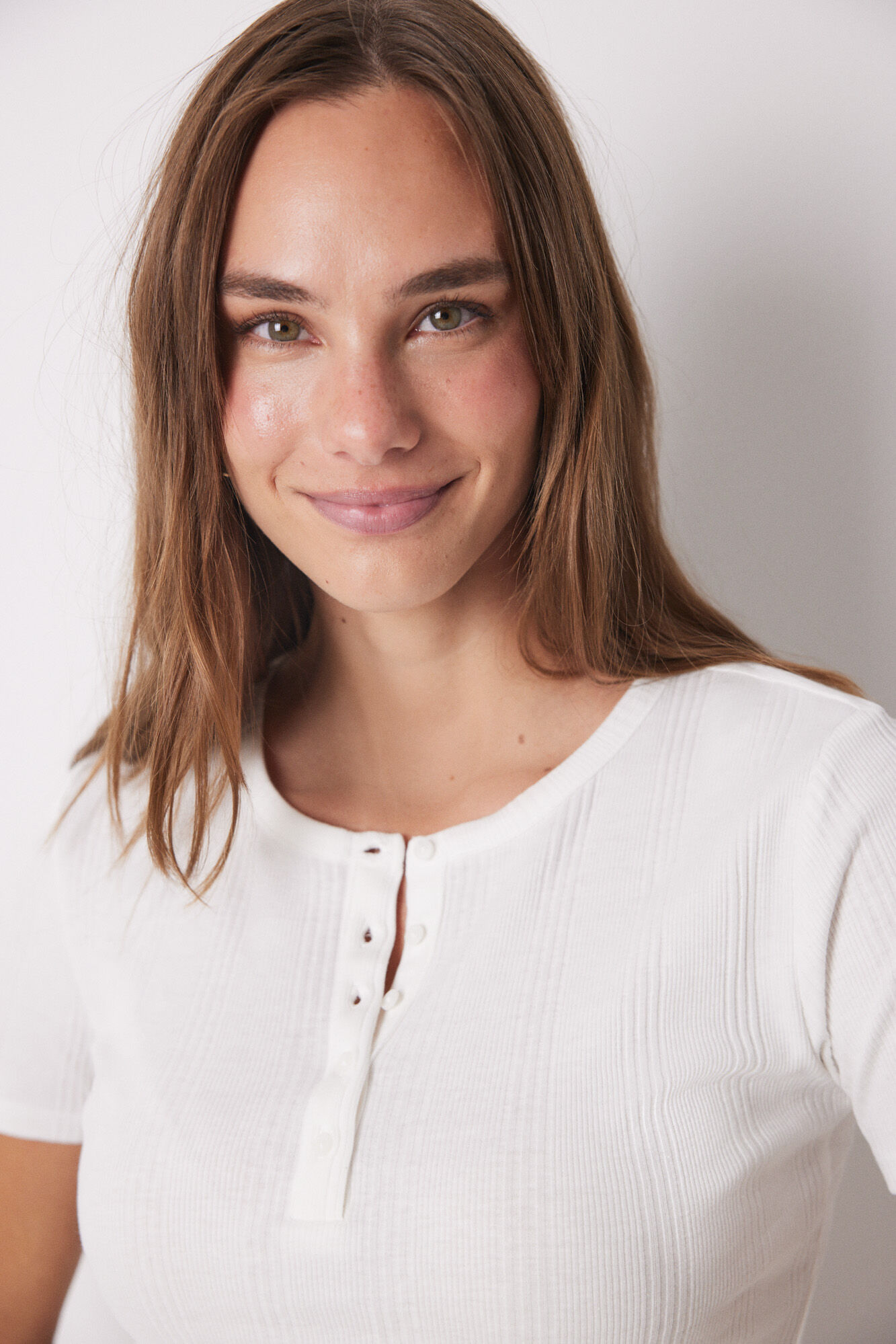 Short sleeve T-shirt, in cotton ribbed fabric , plain in ivory. It”s so practical and comfortable that you won”t want to take it off all day. Perfect for this season! Baker style, with a round neckline and front placket detail with mother-of-pearl buttons