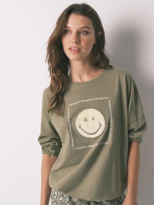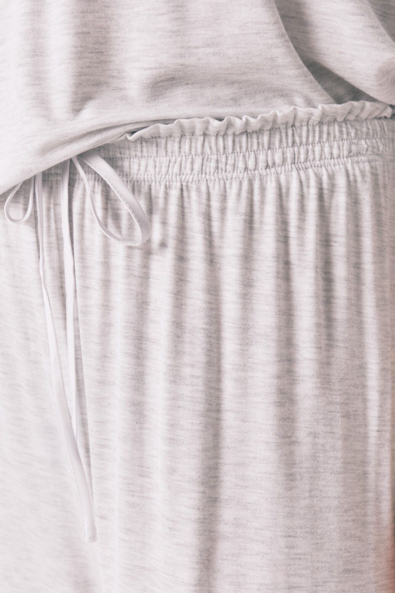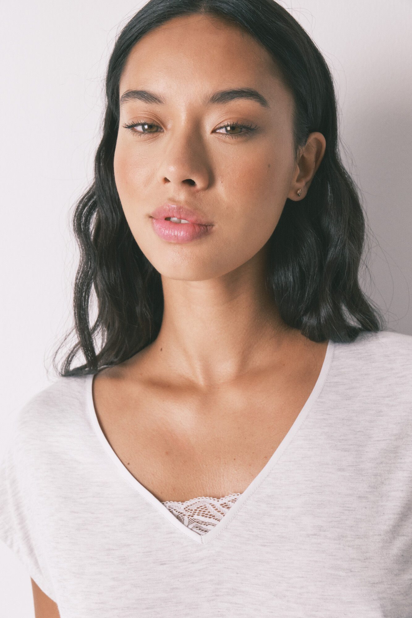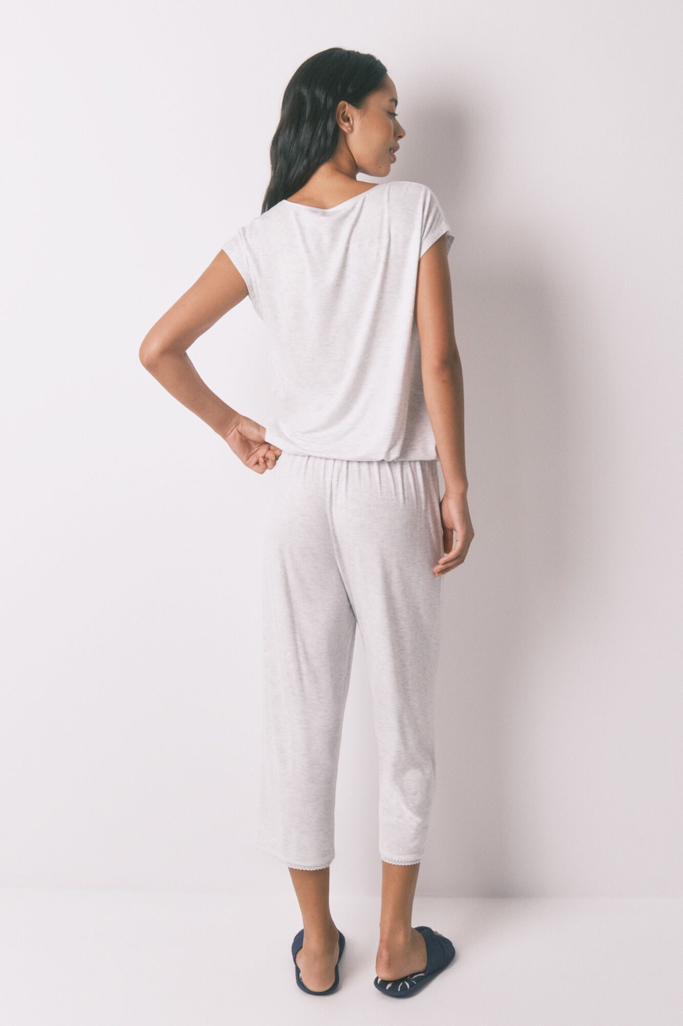 Plain short sleeve pyjamas set with capri trouser , made of soft ECOVERO™ viscose fabric with a soft touch finish . V neckline with decorative lace , short sleeve and a gathered hem that can be adjusted with a tone-on-tone drawstring. The trouser are fitt