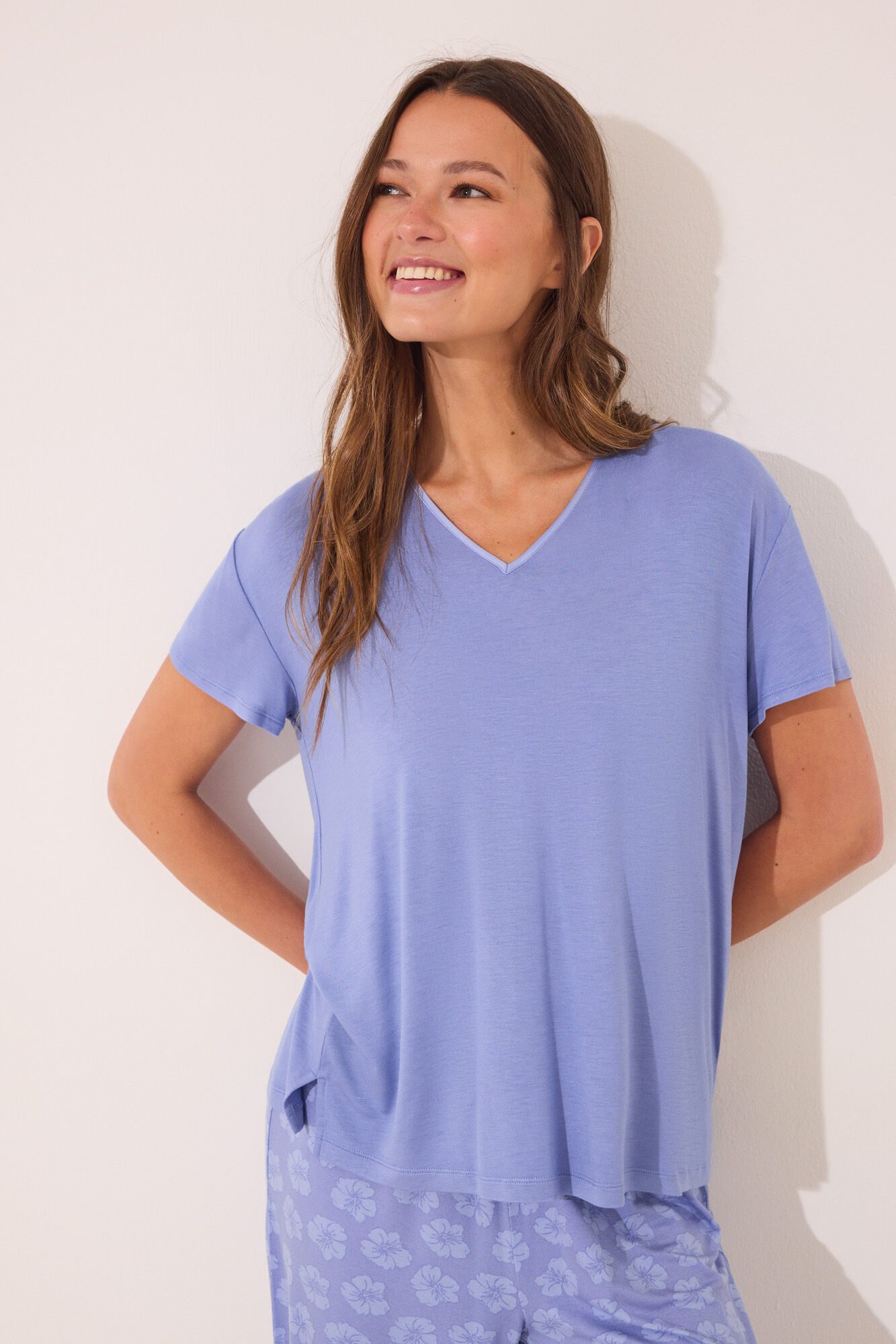 Capri-length, short sleeve pyjamas made from viscose with a soft touch finish . short sleeve top with dropped shoulders and a V neckline with matching satin piping . Capri trouser with a very subtle all-over floral print and an elastic waistband adjustabl