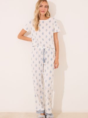 Short sleeve pyjamas set with long trouser made of viscose satin. Plain top with a V neckline and contrasting buttons slit , dropped shoulders, side slits at the hems, and a longer back hem . Lounge trouser with an allover fleck print and an elastic waist