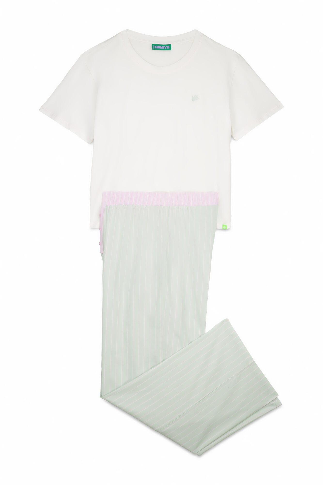 Short sleeve sleeved single- jumper cotton pyjamas with long cotton poplin . Plain top with a round neck, dropped sleeve , and a fitted bust, chest or breast. Trouser with a striped print and contrast waistband . Perfect for sleeping in style this summer.