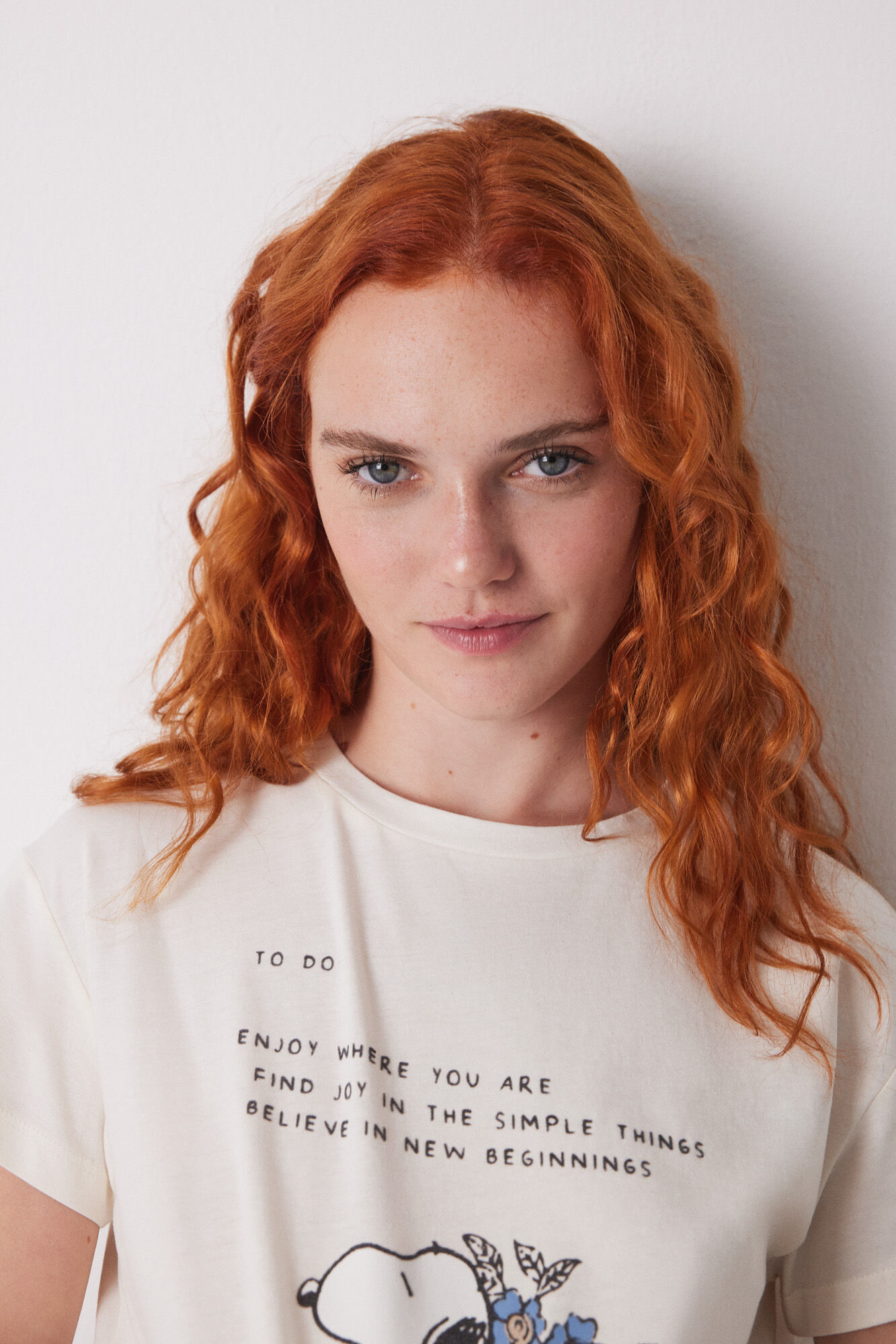 -70%short-sleeved T-shirt, made of 100% soft cotton fabric , in white with a front print of Snoopy. It is so practical and comfortable that you won’t want to take it off all day long.
