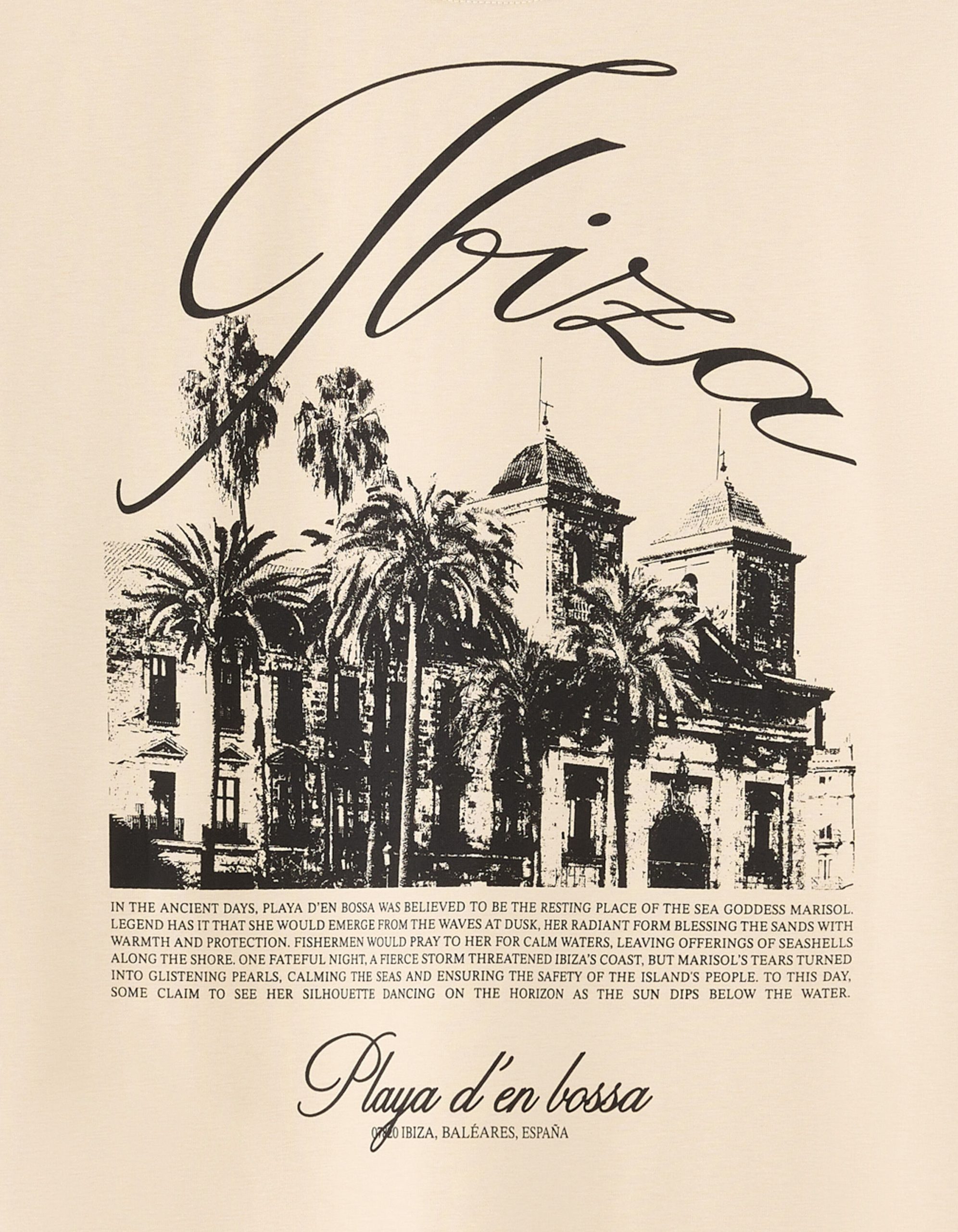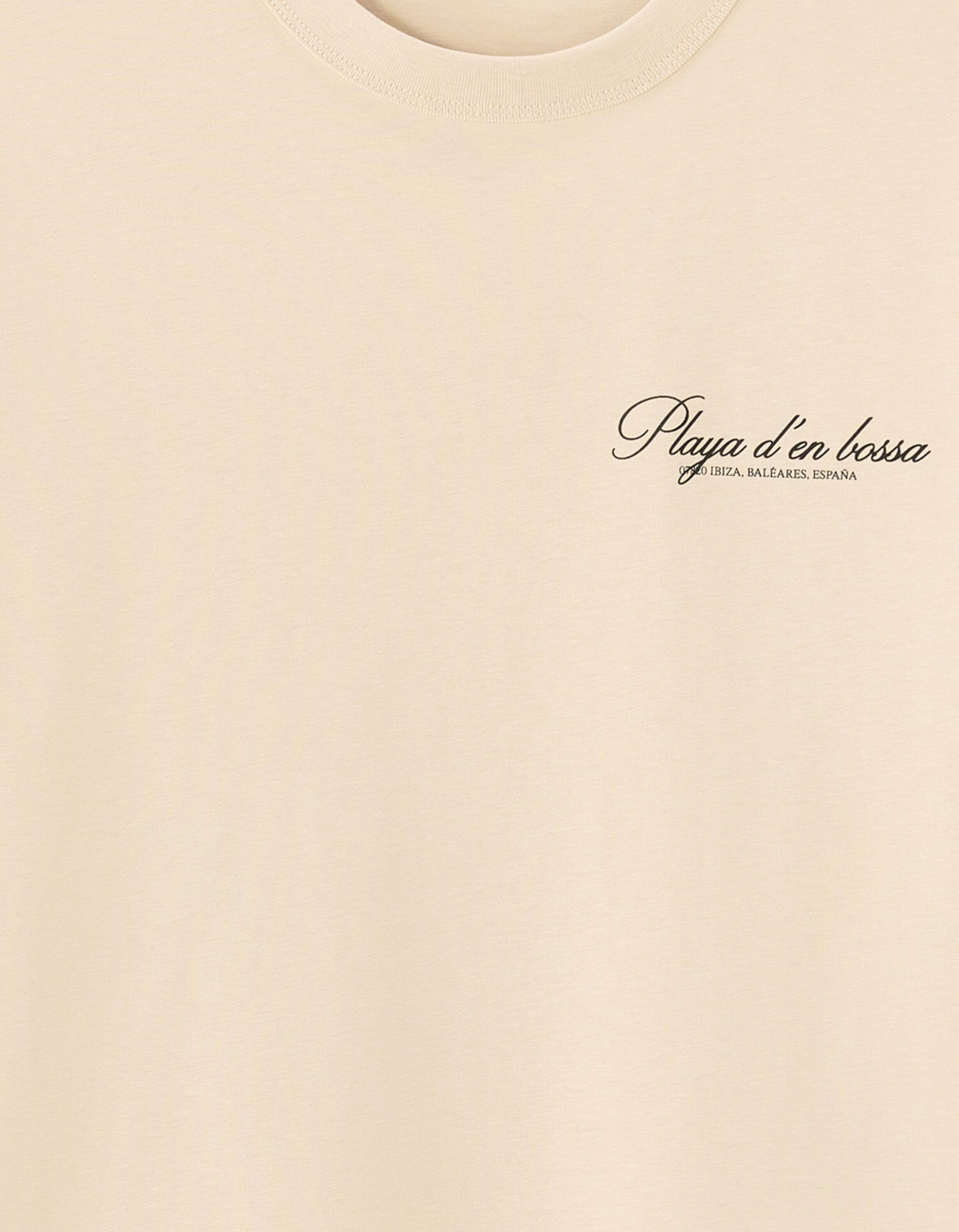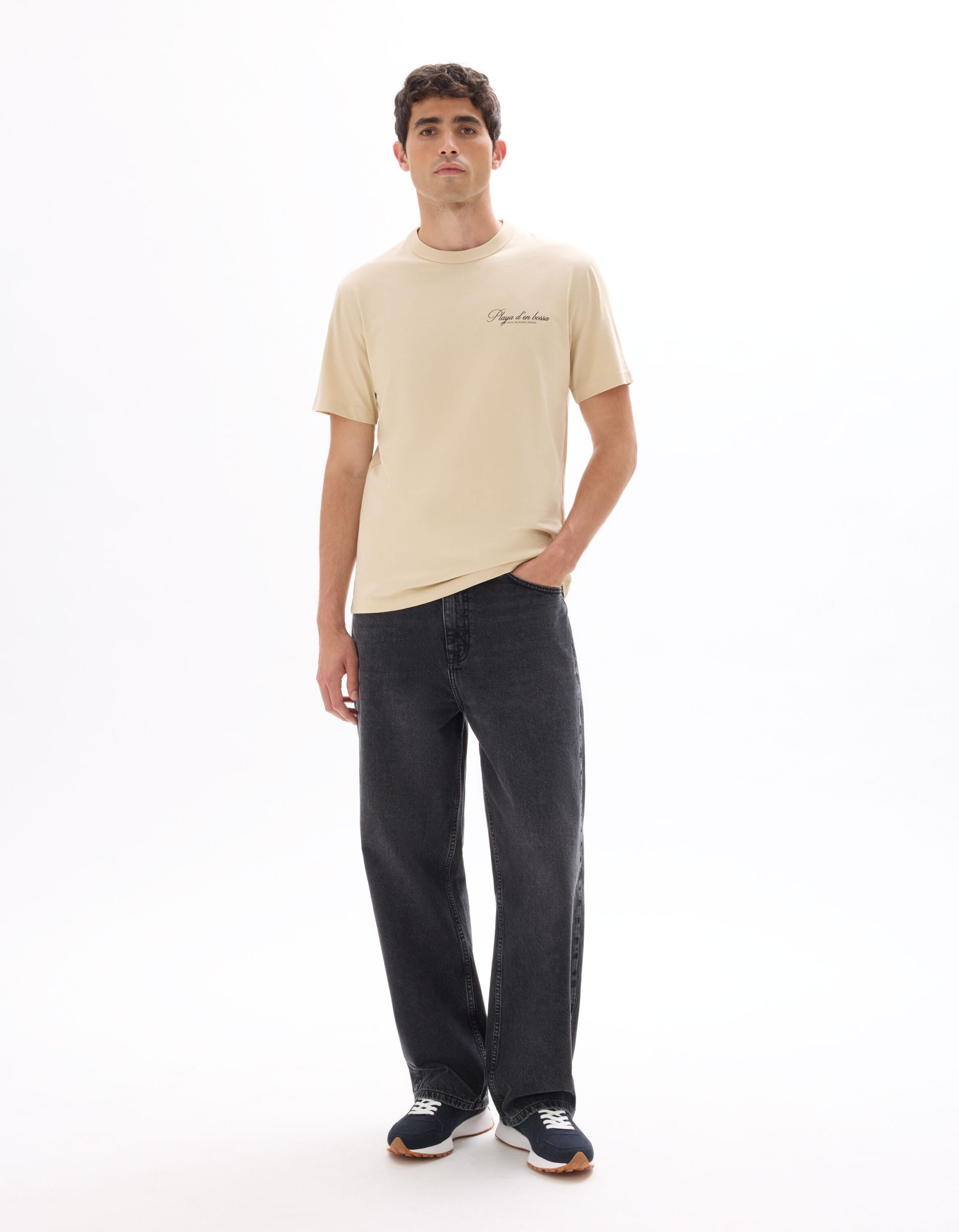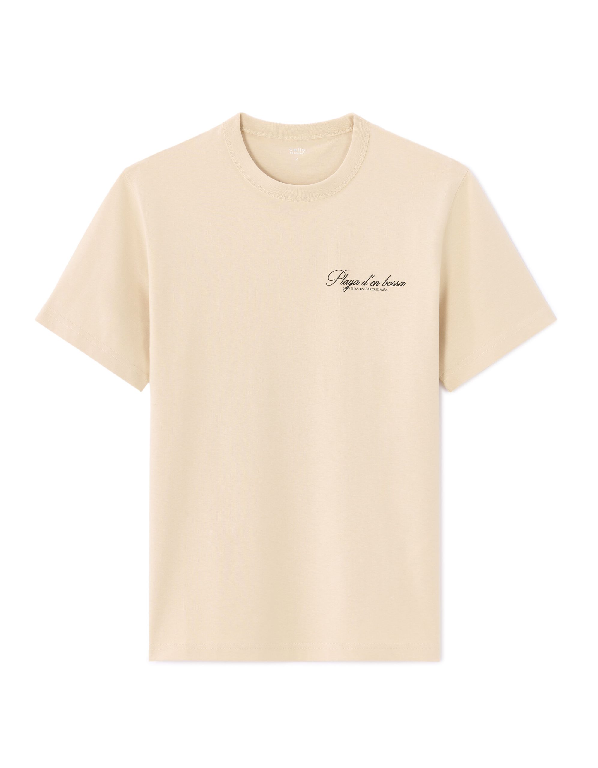 Show off a relaxed, urban style with this men’s t-shirt, a summer wardrobe essential. This beige, short-sleeved t-shirt features a boxy fit, is made of 100% cotton, has a crew neck, and a city print. Pair it with a…