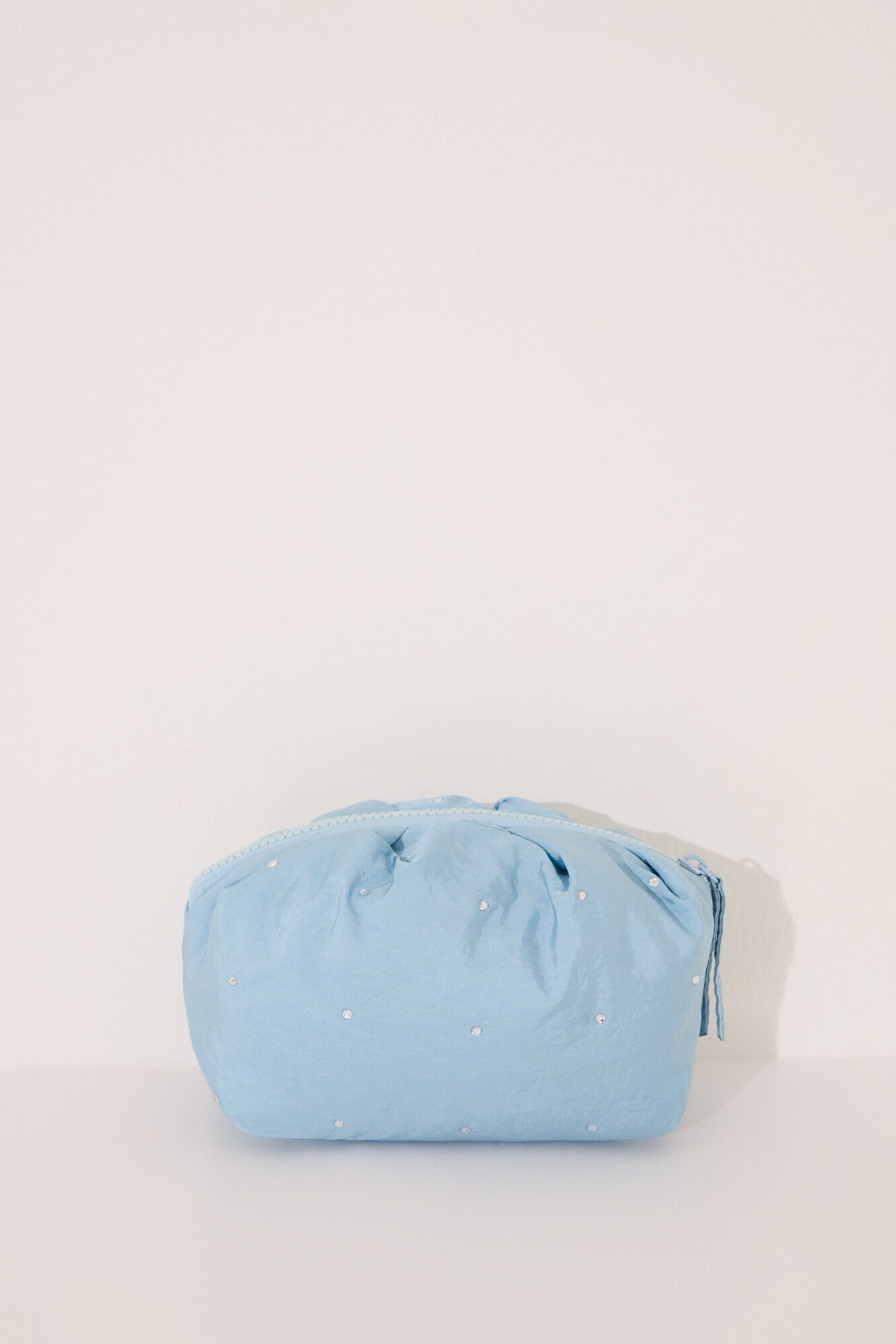 Small quilted vanity case in light blue nylon with a metallic WS logo . Perfect for carrying your essentials in a compact and stylish way. Durable quilted material. Compact design, ideal for everyday use. Metallic WS logo for a sophistic