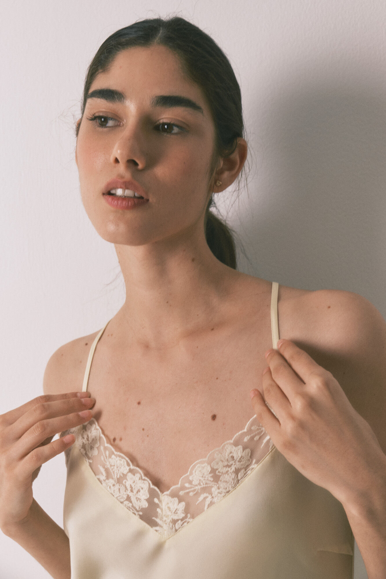 – V – neckline with lace detail and reinforced bust, chest or breast with inne