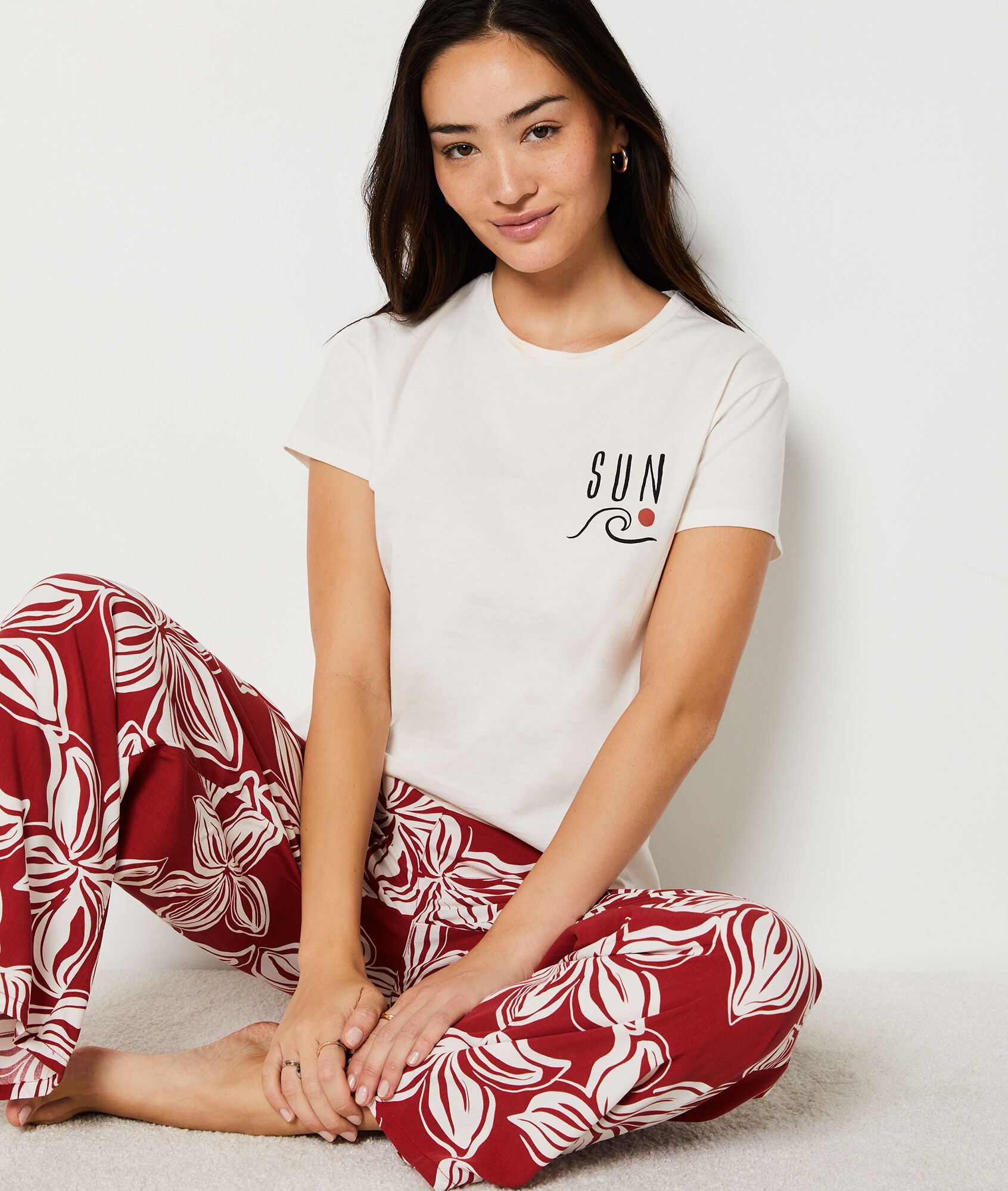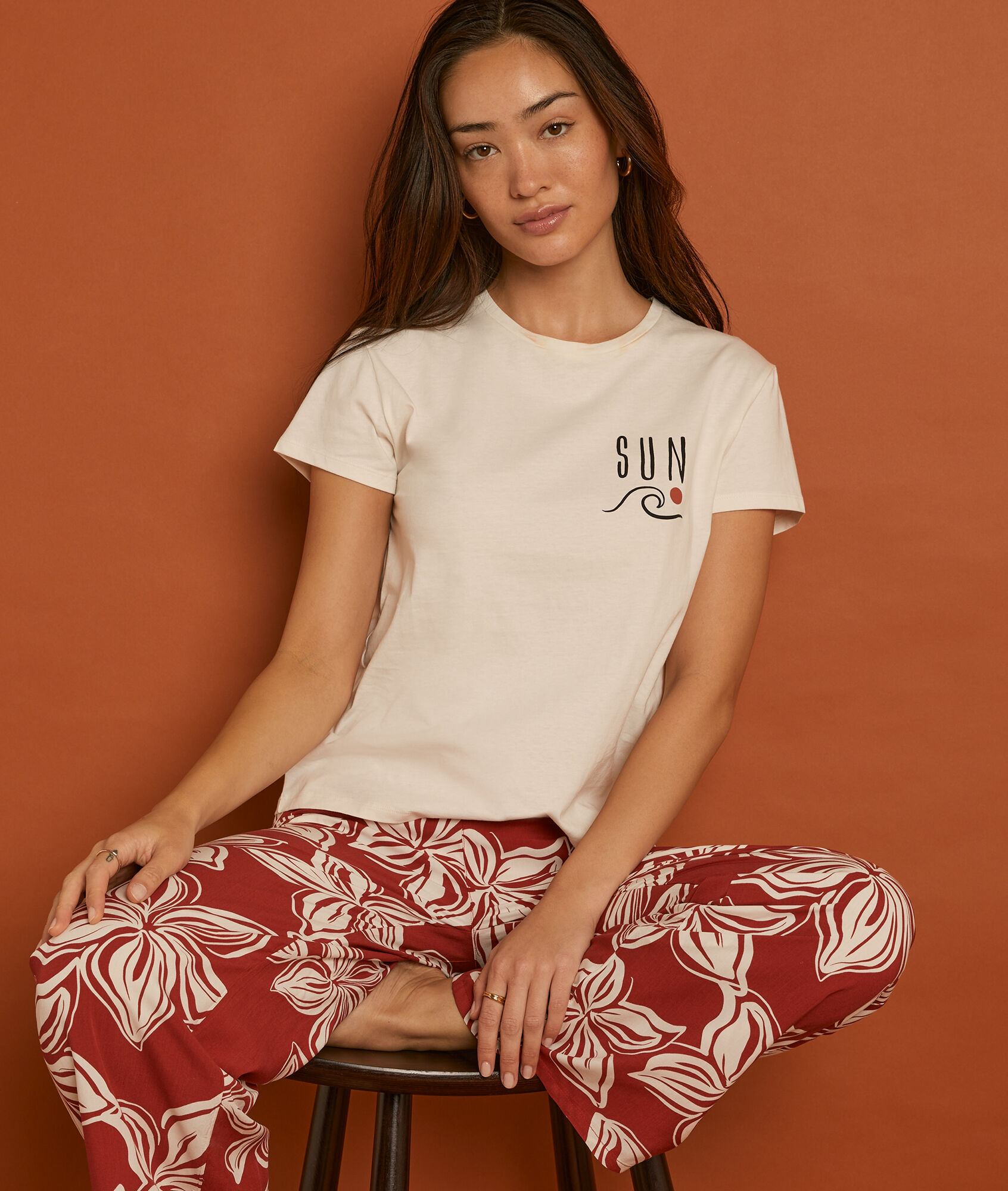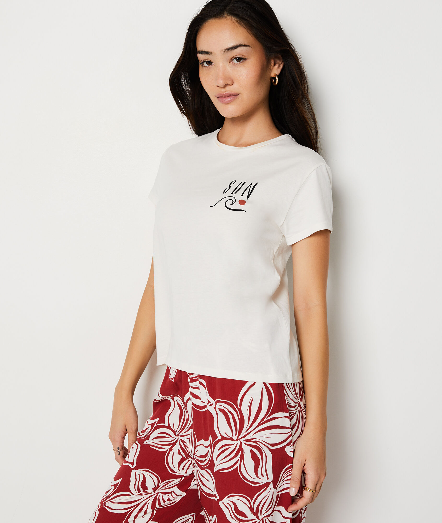 Featuring a round neck and short sleeves, this cotton pajama T-shirt is decorated with a wave print and the word Sun”.”””
