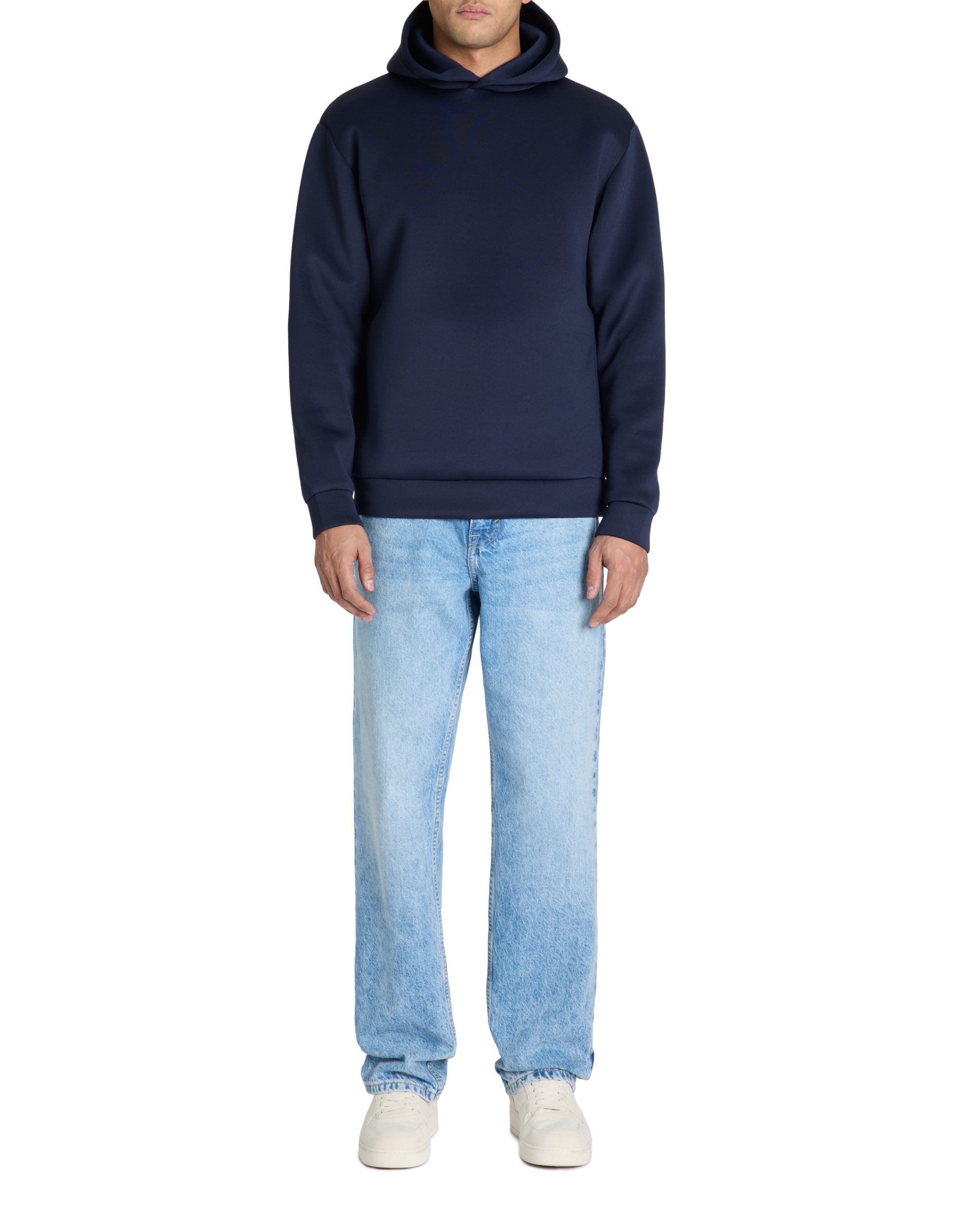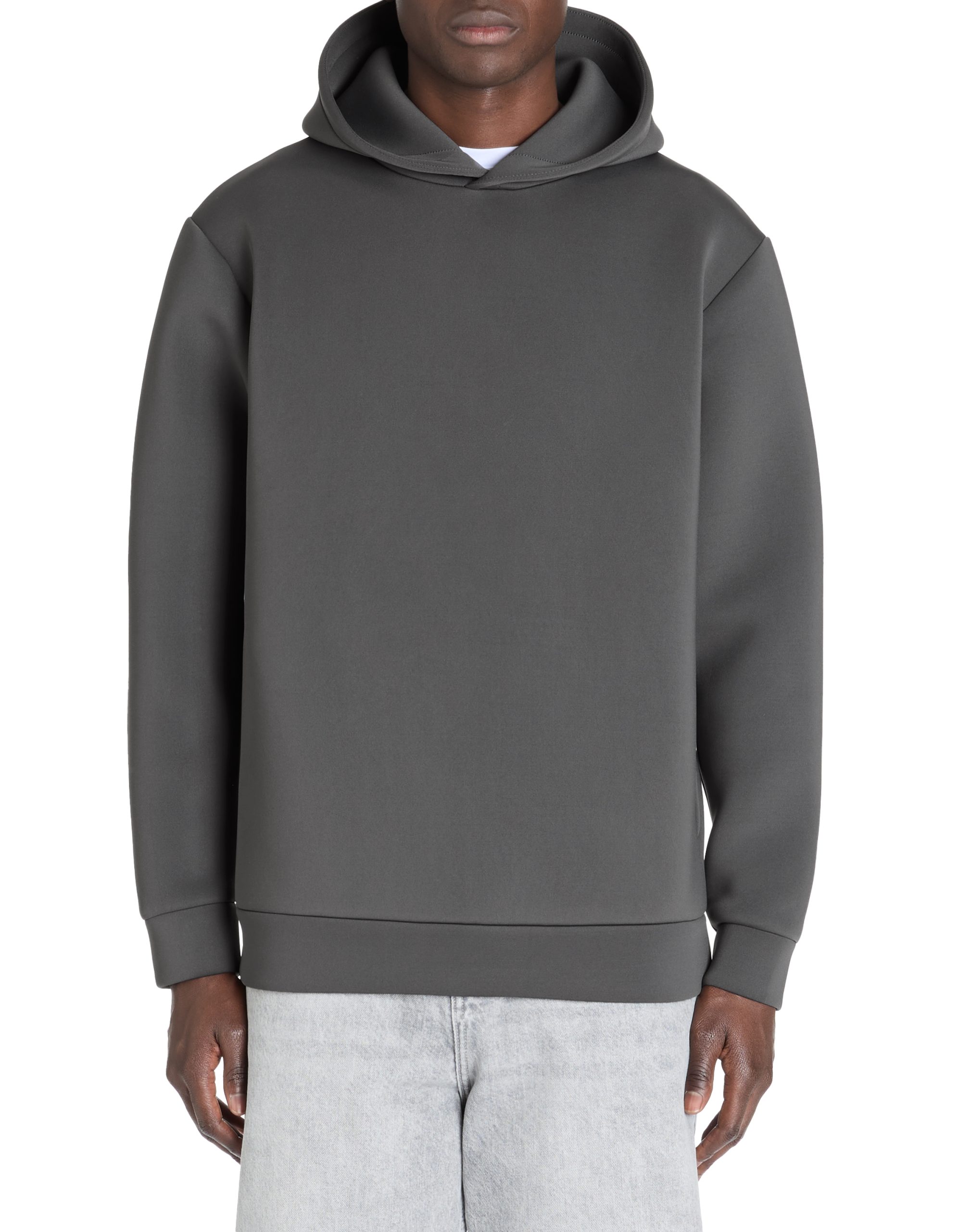 modern sweatshirt for men. Ideal for a casual and trendy style. Plain white sweatshirt Neoprene "scuba" material Long sleeves Hooded collar Pocket not specified Feel not specified Texture effect not specified Occasion not specified Hood type Spe