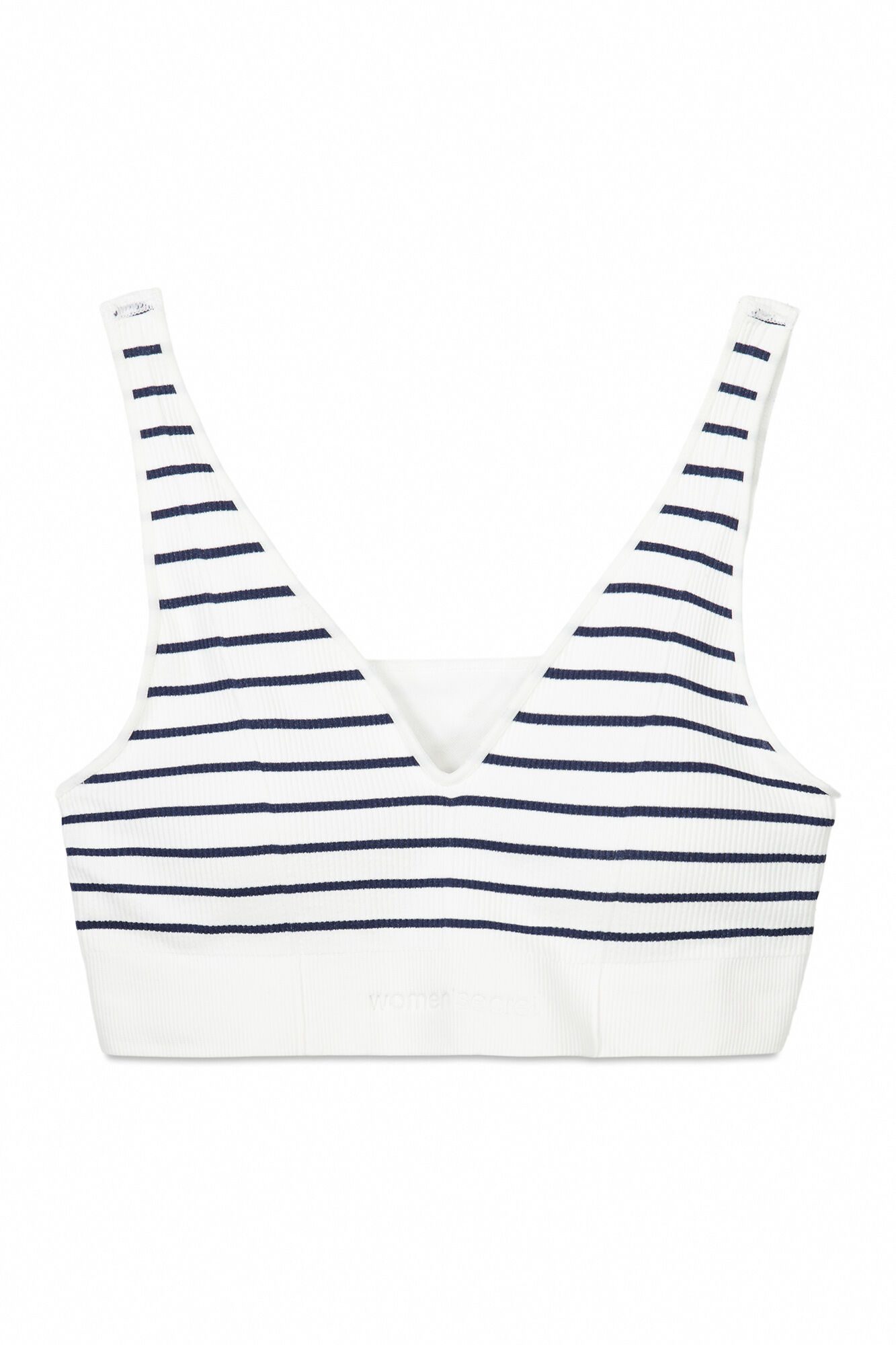 Seamless, ribbed textured bra in blue with a striped print . Wear it as a bra or as a top . It’s your choice!
