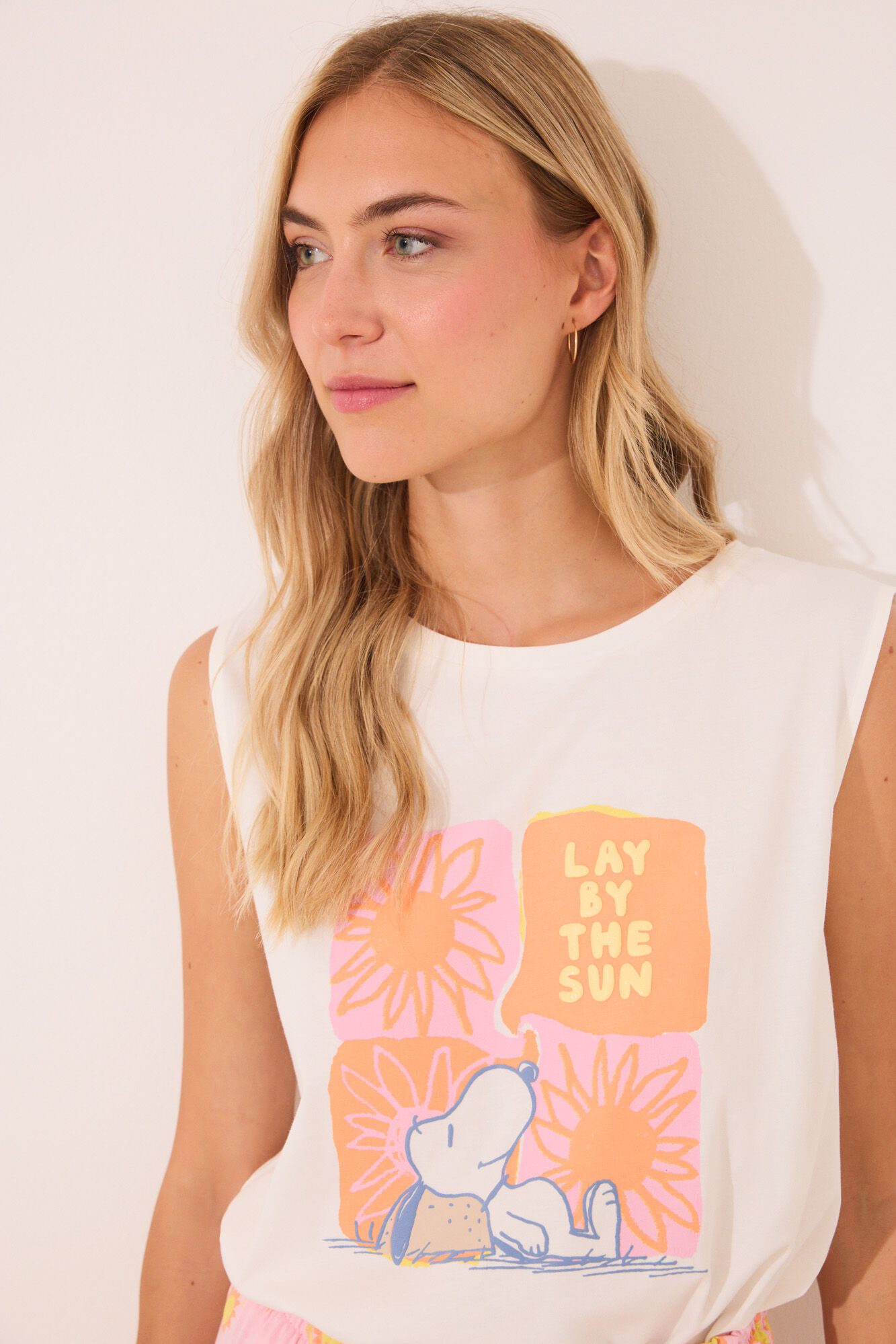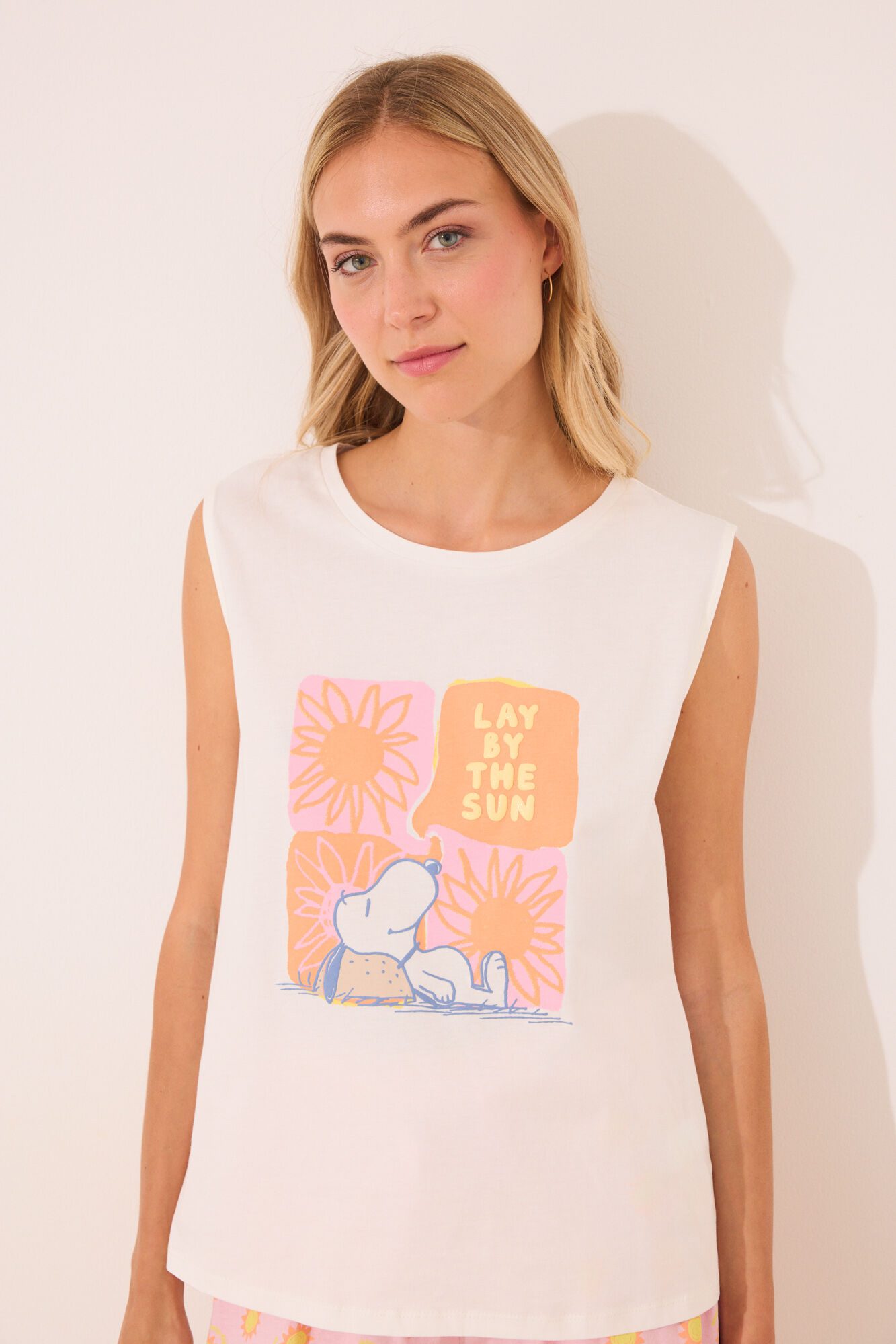Sleeves pyjamas and trouser in 100% cotton. The top has a round neck, wide straps, and fun Snoopy logo on the front. The trouser have an all-over sun print and an elastic waistband with a matching drawstring. Match it with an accessory from the coll