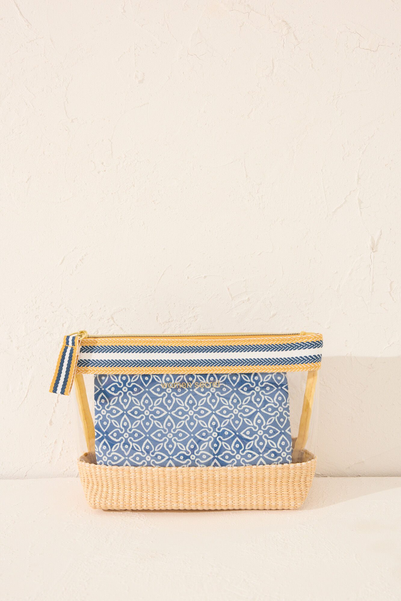 Pack of three toiletry bags, one larger, transparent, case-shaped, containing two others inside, with a floral print in blue and mustard colors. Ideal for organizing all your beauty essentials into sections. Wear it to match the sandals in the