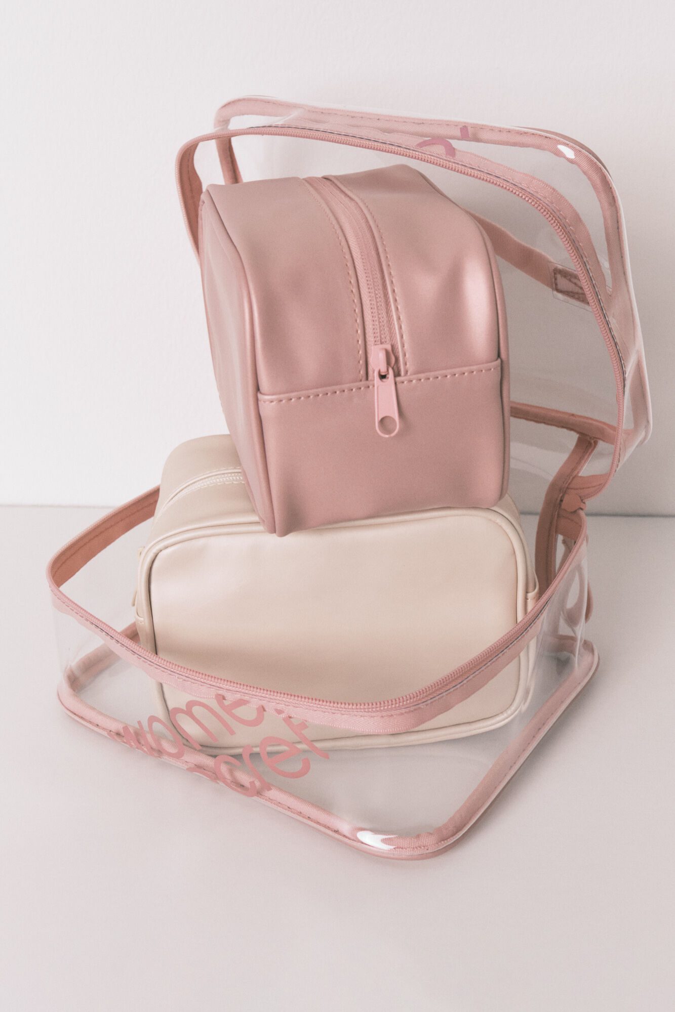Pack of 3 toiletry bags, one large, medium-sized transparent bag and two smaller, rubber-quality case-style bags with a zip fastening and logo detail. Super comfortable and capable of carrying all your beauty essentials . Metallic pink and ivory.