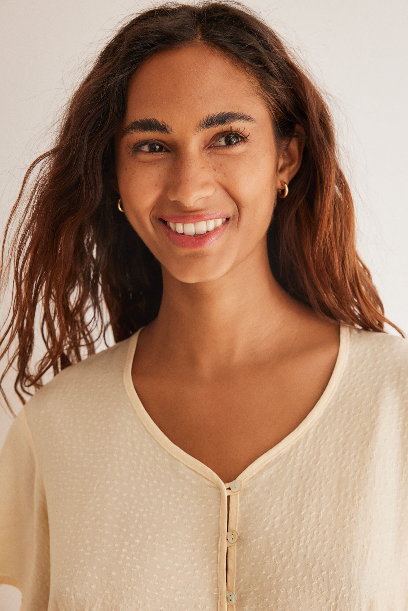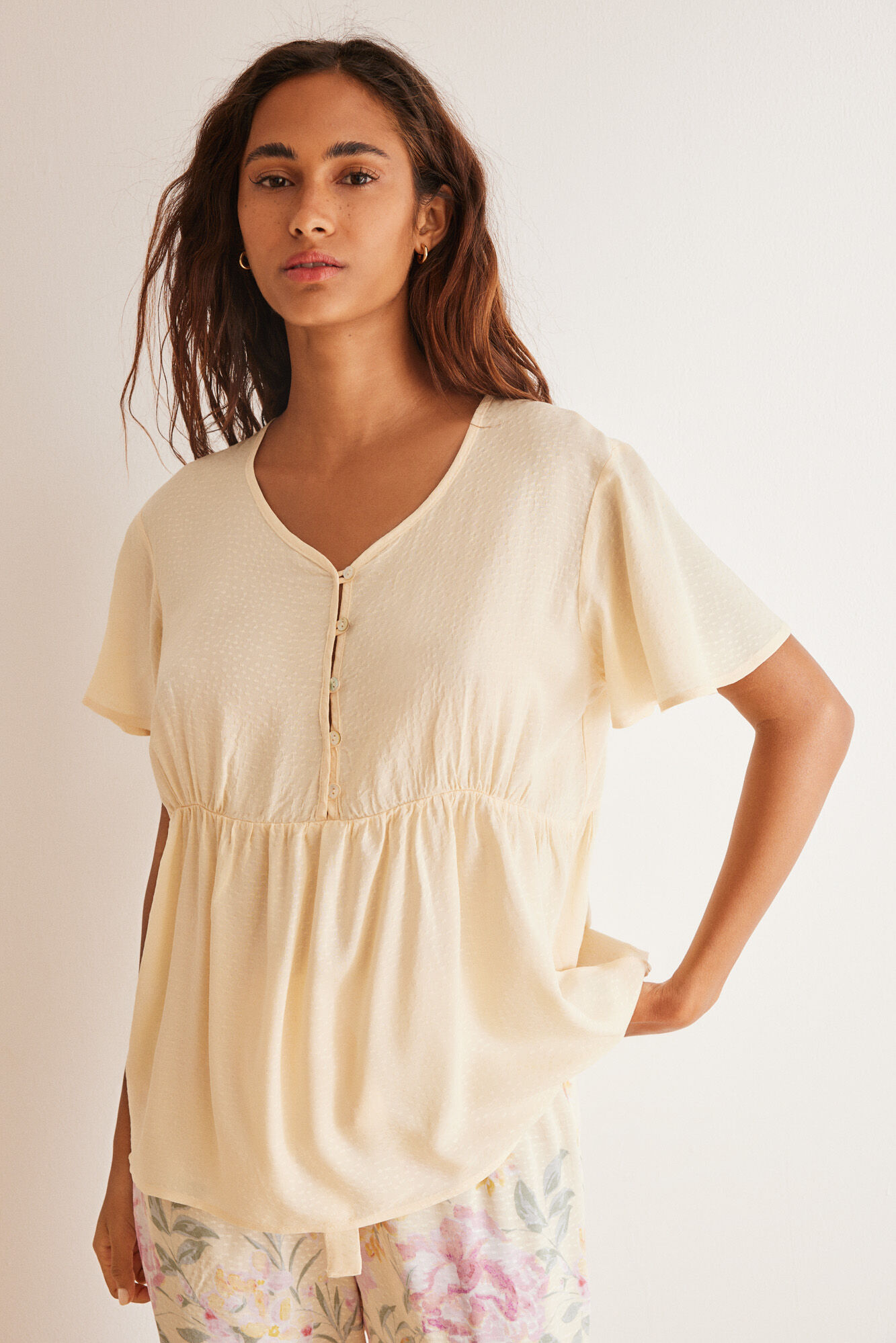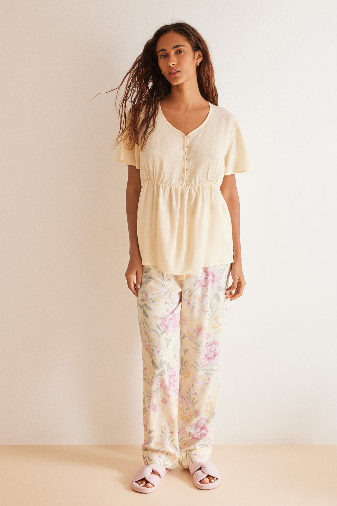 Pyjamas in viscose fabric, with short sleeves and long bottoms, in yellow with a floral print. It”s so practical and convenient, that you won”t want to take it off all day. Perfect for this summer! & Lt; br & gt;-Round neck top with button detail and seam