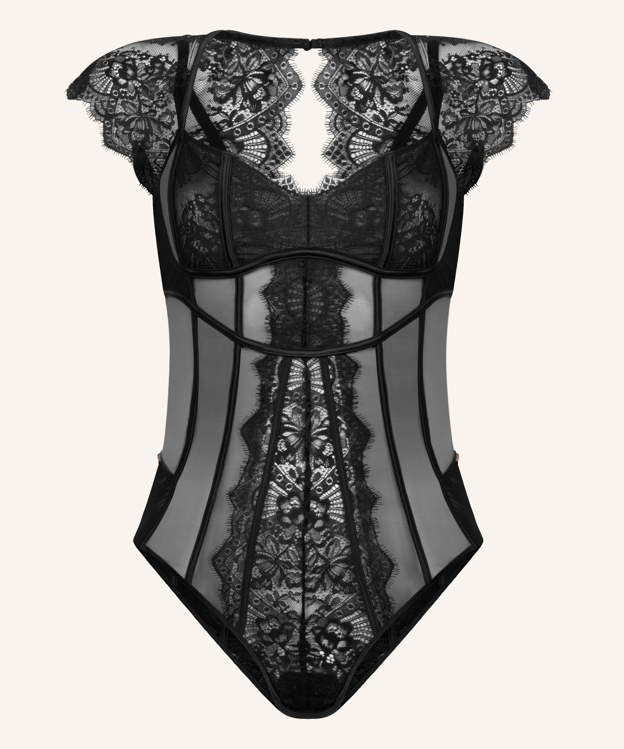 The Zoe bodysuit features short cap sleeves and an open back for a sophisticated, yet daring look. Crafted with delicate, transparent lace, it offers a feminine touch while maintaining a modern edge. The lace’s intricate design enhances the bodysuit’s allure, blending coverage with sensual transparency. This piece is perfect for elevating any wardrobe, designed with a focus on both comfort and style.